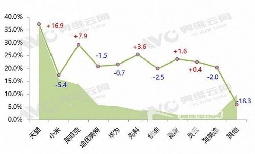 据线上监测数据显示,OTT盒子TOP4品牌份额是71.7%。天猫零售量占比是36.4%,同比上涨16.9个百分点;小米零售量占比是15.8%,同比下降5.4个百分点;英菲克零售量占比是13.7%,同比上升7.9个百分点;迪优美特零售量占比是5.8%,同比下降1.5个百分点。