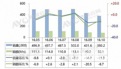 OTT盒子一直在风雨中飘摇,而“十一”促销热潮也没有拯救OTT盒子升量的命运。OTT业整体大环境来看,监管政策依然存在,而OTT盒子企业对于政策的导向已经熟知,因此今年的市场已经趋于平稳,相较去年,目前市场缓慢前进中。奥维云网(AVC)线上监测数据显示: 2016年10月OTT盒子零售量为38.0万台,环比下降11.9%,同比下降0.2%;零售额为0.82亿元,环比下降8.7%,同比下降0.3%。