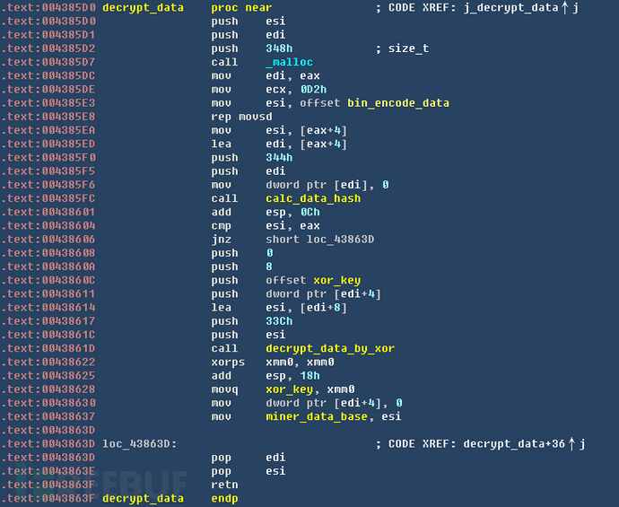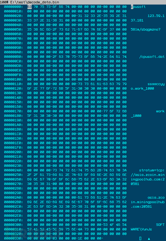 如上图,加密数据偏移+4的位置存放有32位哈希值,用来进行数据校验。数据验证有效后,调用decrypt_data_by_xor进行抑或解密(key数据为0x78817433563212F9,解密后数据地址存放在miner_data_base,下文中不再赘述)。完成解密后数据,如下图所示: