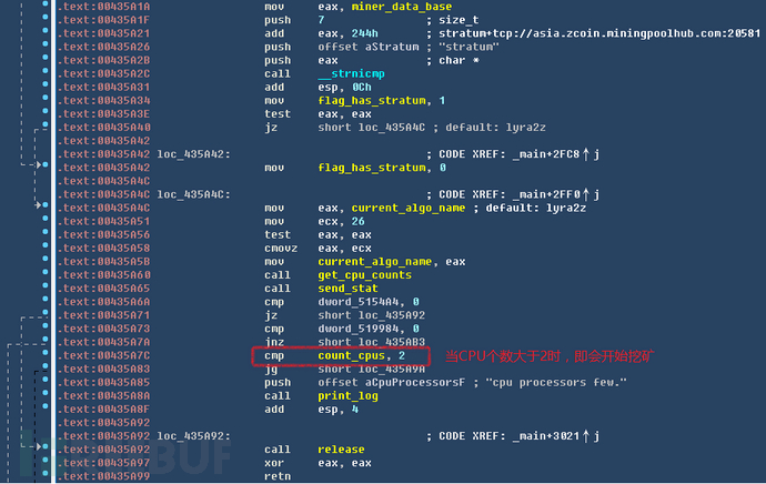 当检测到当前计算机CPU个数大于2时,即会开启挖矿逻辑。如下图所示:
