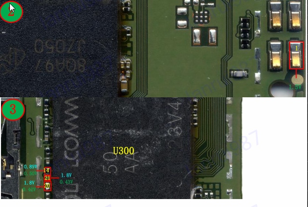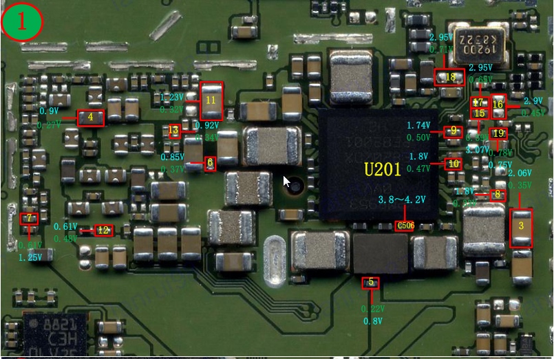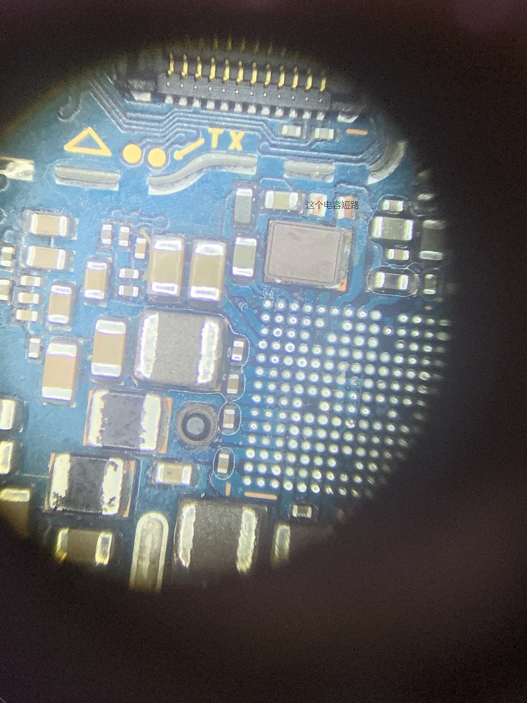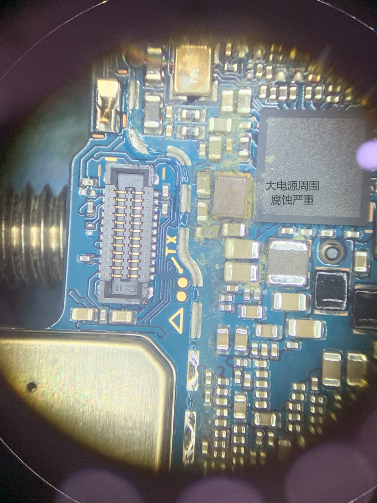 拆机后观察,进水地方不是很多。直接上电大电流1A左右,感温,小电源发烫,直接松香大法,小电源左下角发烫,查点位图是通电池座。有时候电源发烫不一定是它坏了,它输出路上有负载,也会造成发热。拆开大电源屏蔽罩,发现周围腐蚀严重,清洗出来。拆下大电源(腐蚀严重下边可能也有腐蚀)。上电,还是大电流。直接万用表查电源周围电容,找到主供电短路。扣掉短路电容,一切OK。后来充电也有问题,更换尾插解决故障。