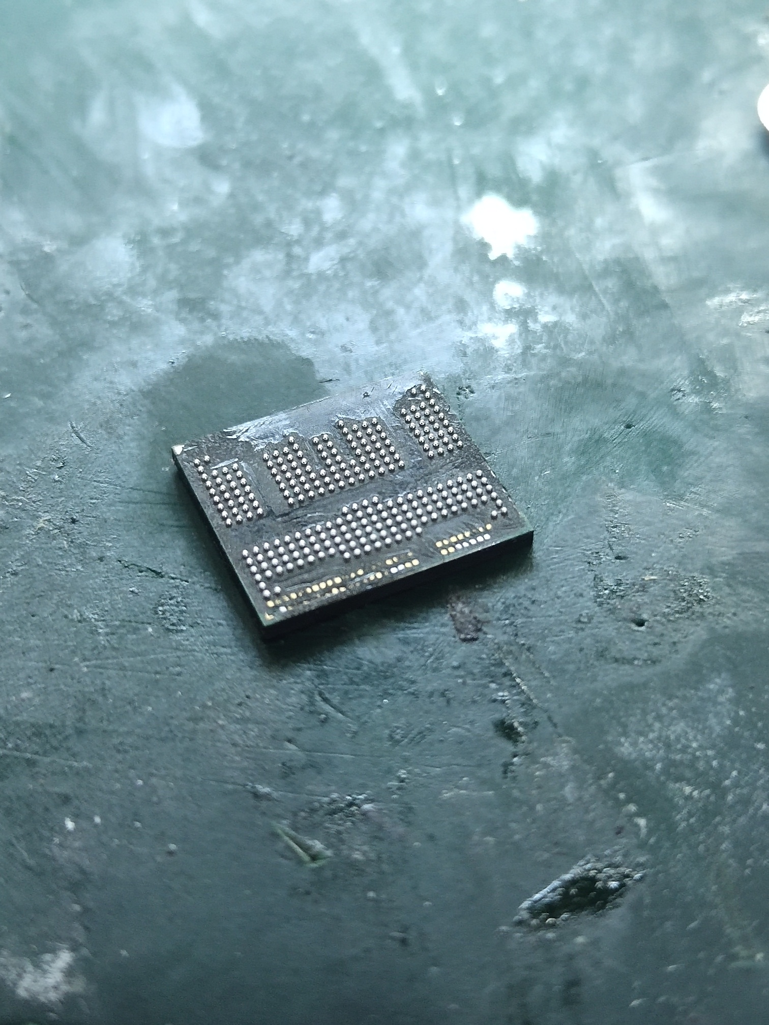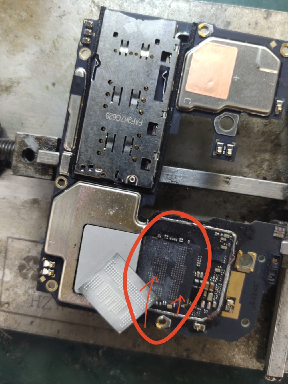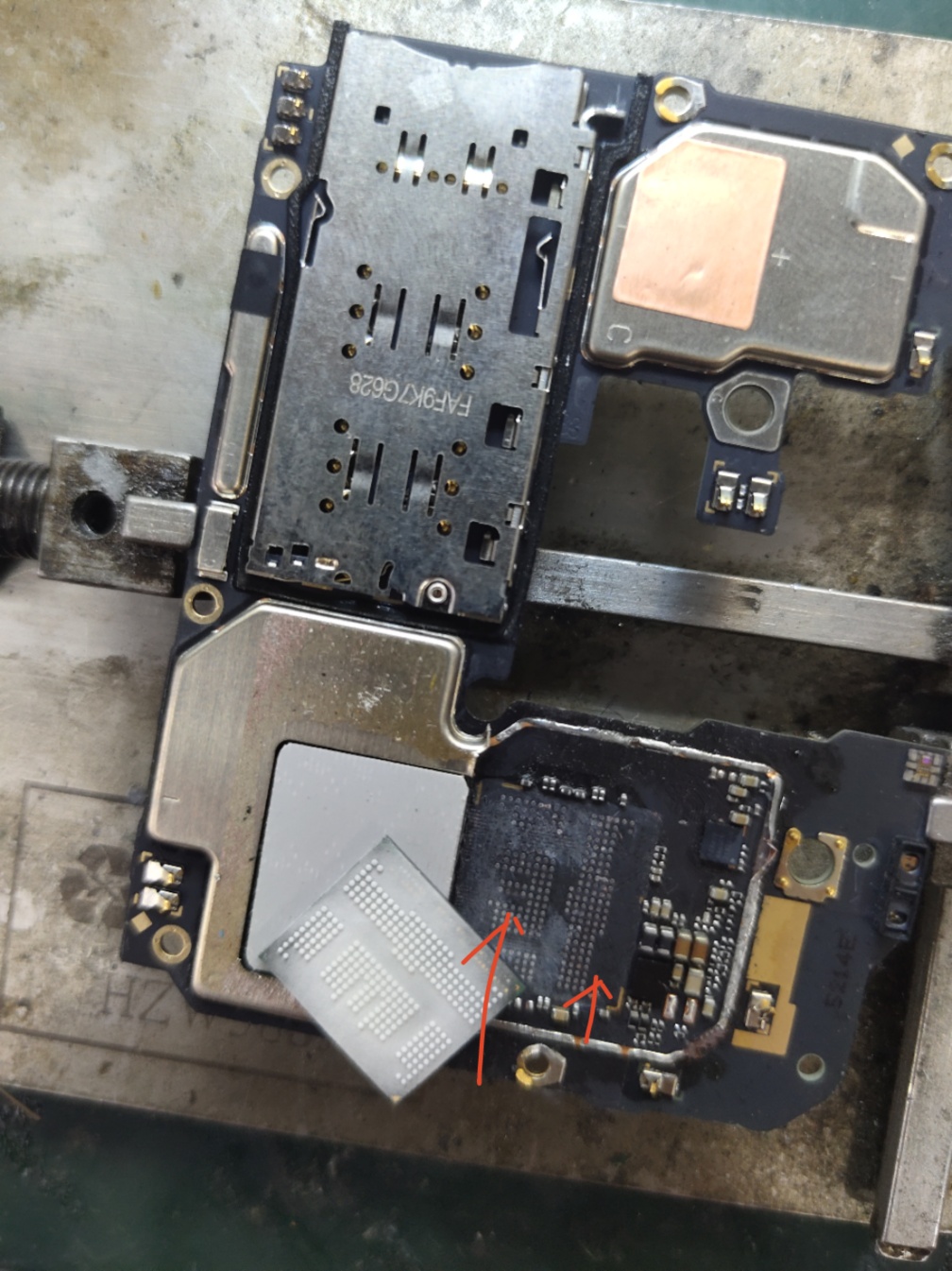 取下主板,开始撬字库,这个字库周围的屏蔽罩都被我剪了,因为屏蔽罩很吸热,也不好下刀,所以我就取了,手工好的朋友可以不用剪。新手还是老老实实像我这样吧都剪了吧。