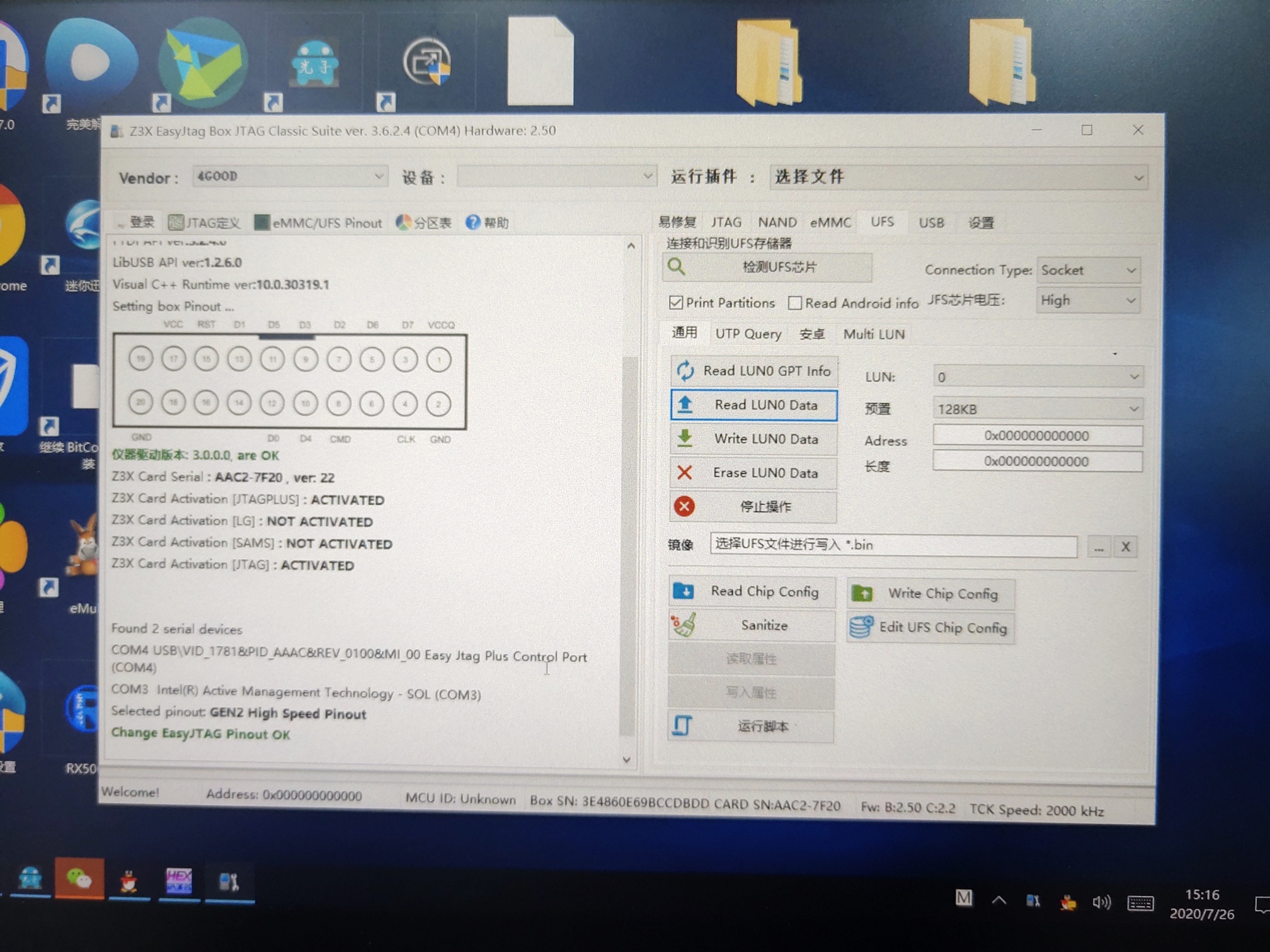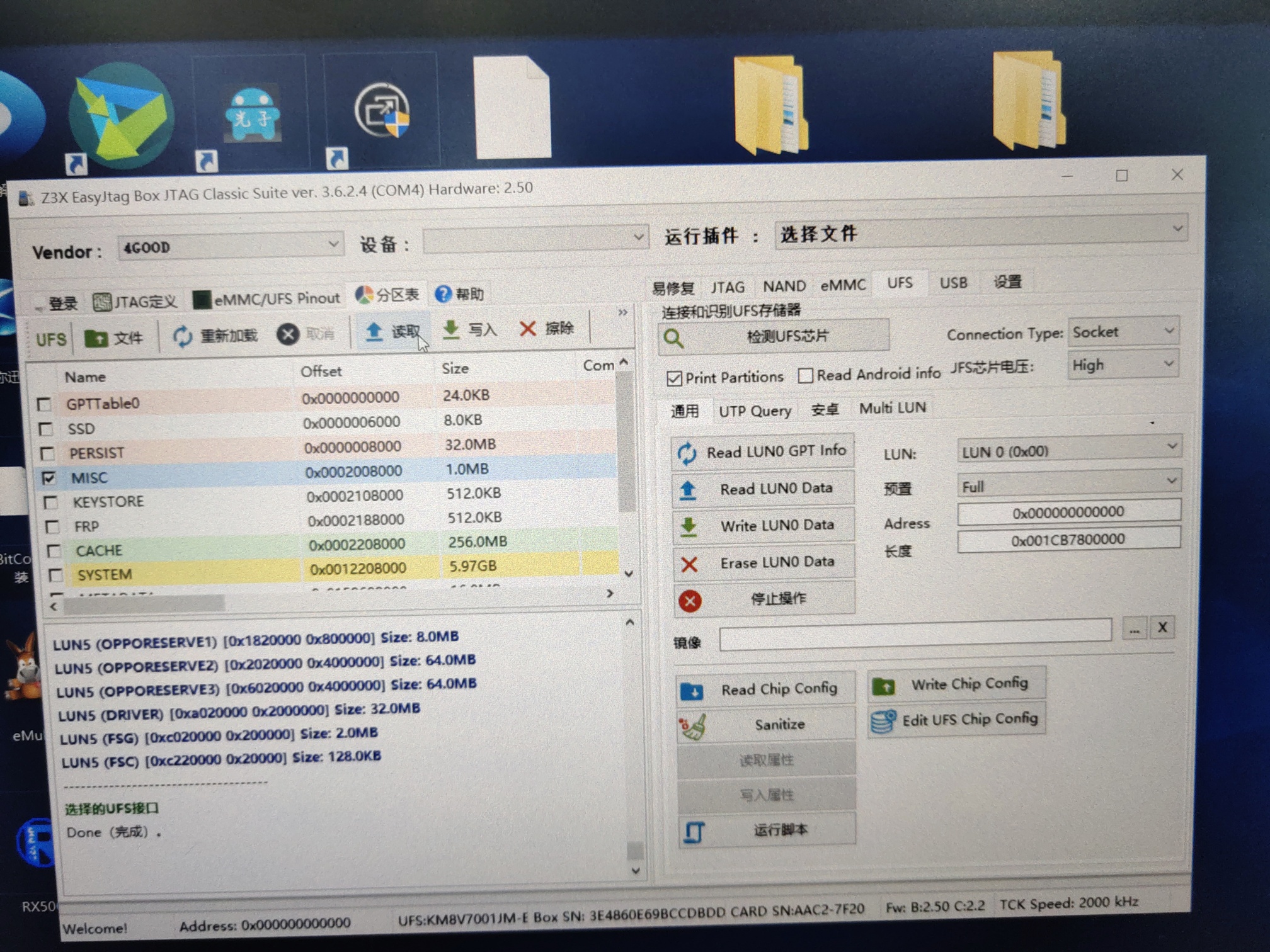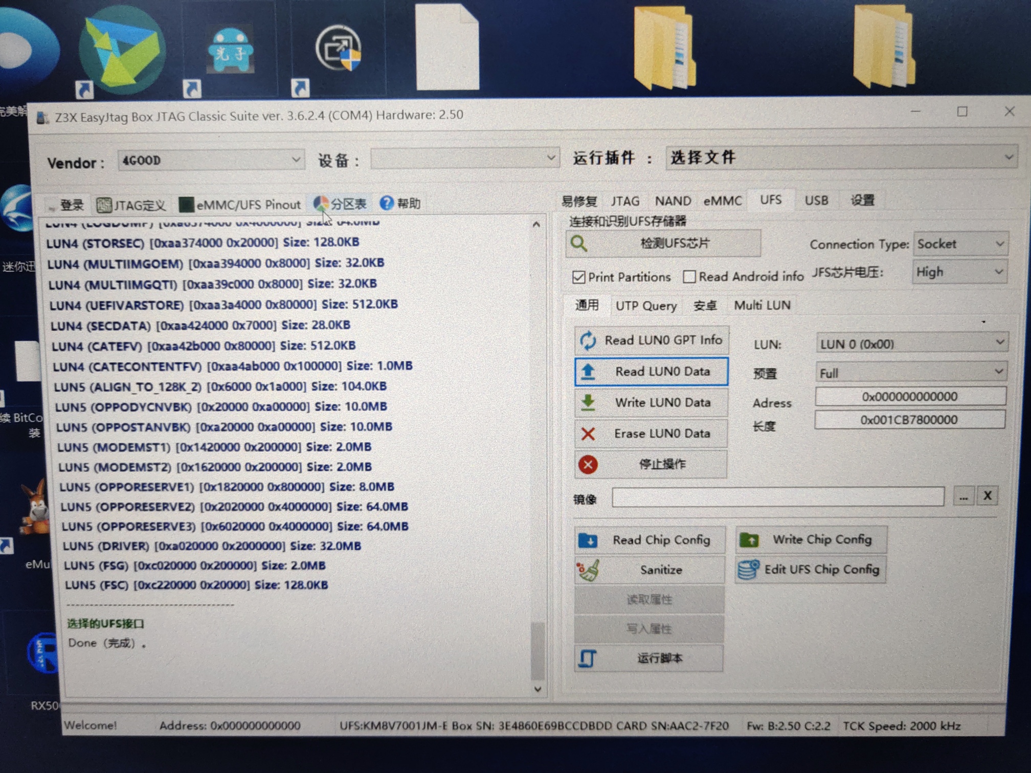 然后打开Easy tool,选择芯片类型,UFS,点击检测UFS,开始读取字库分区。