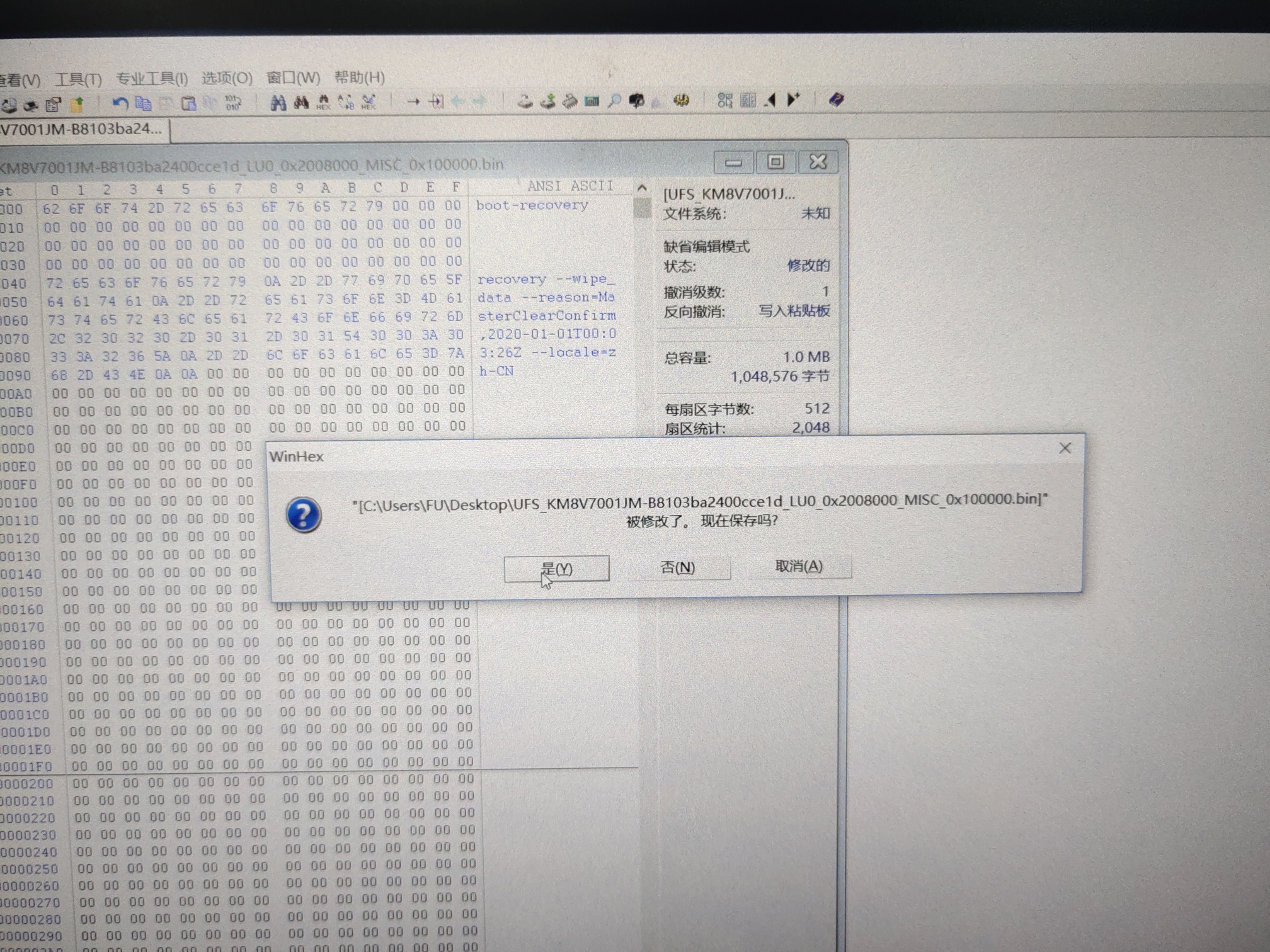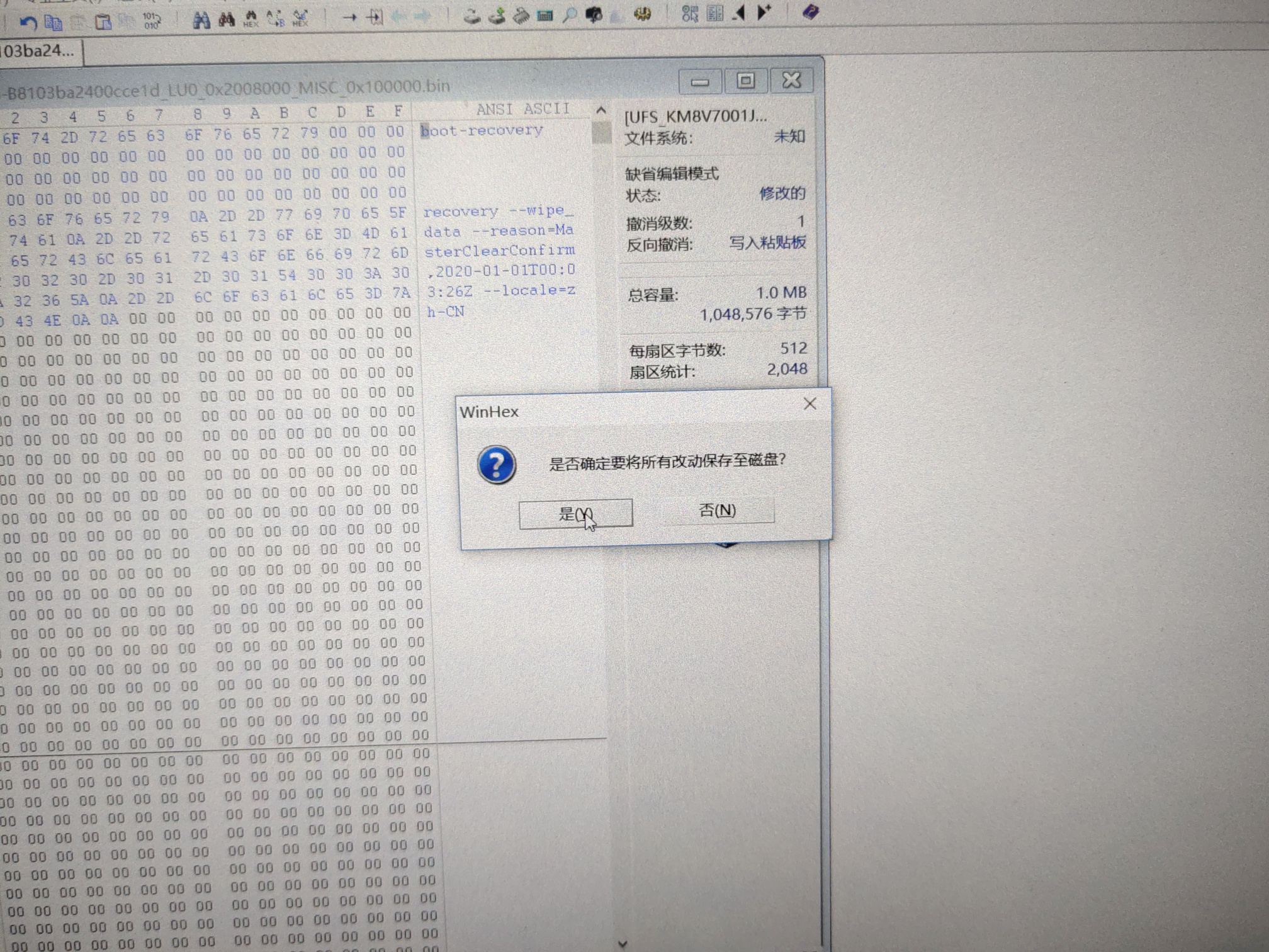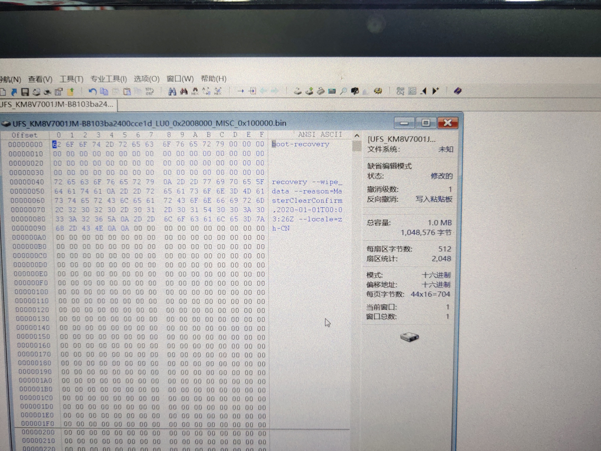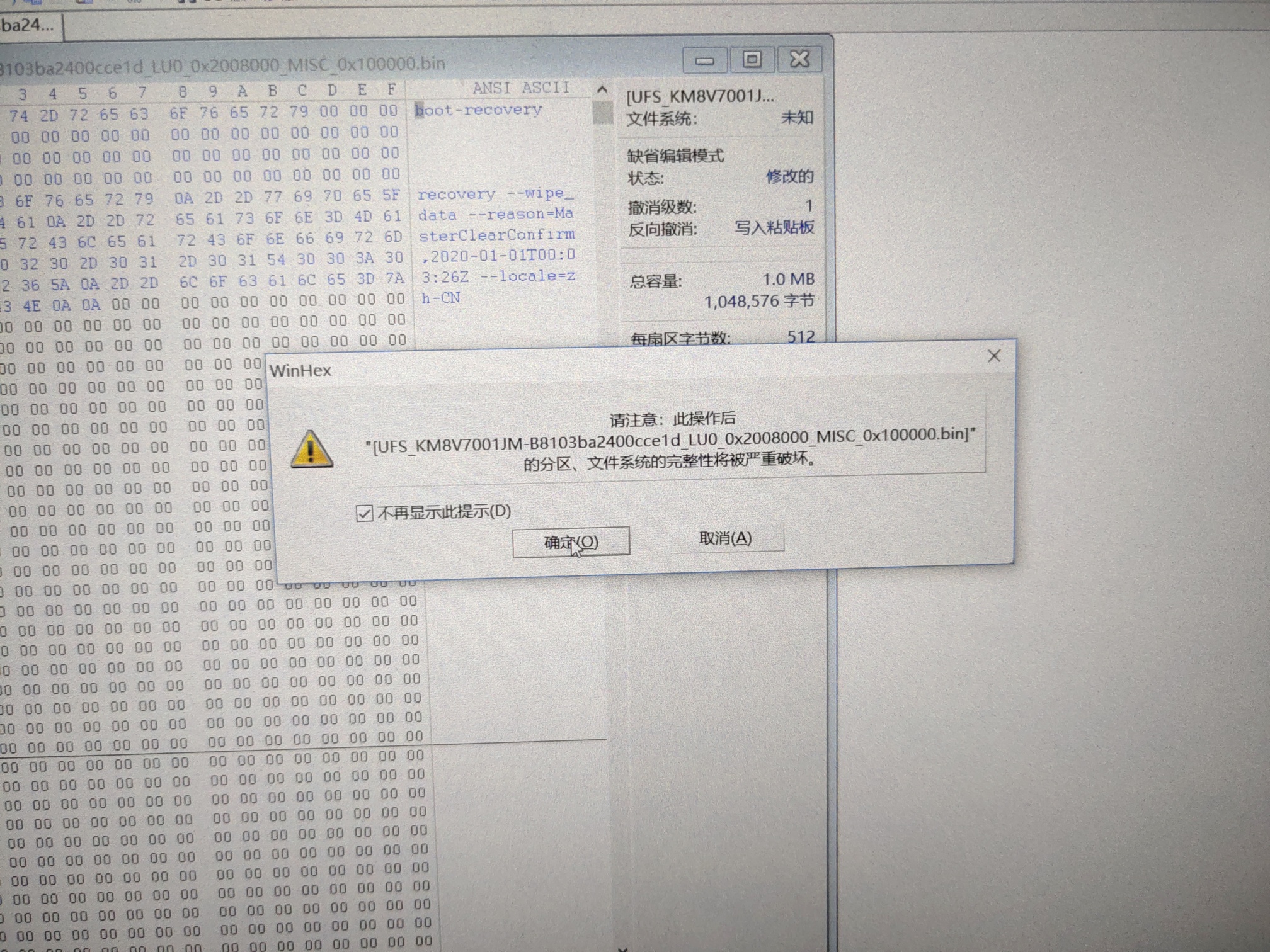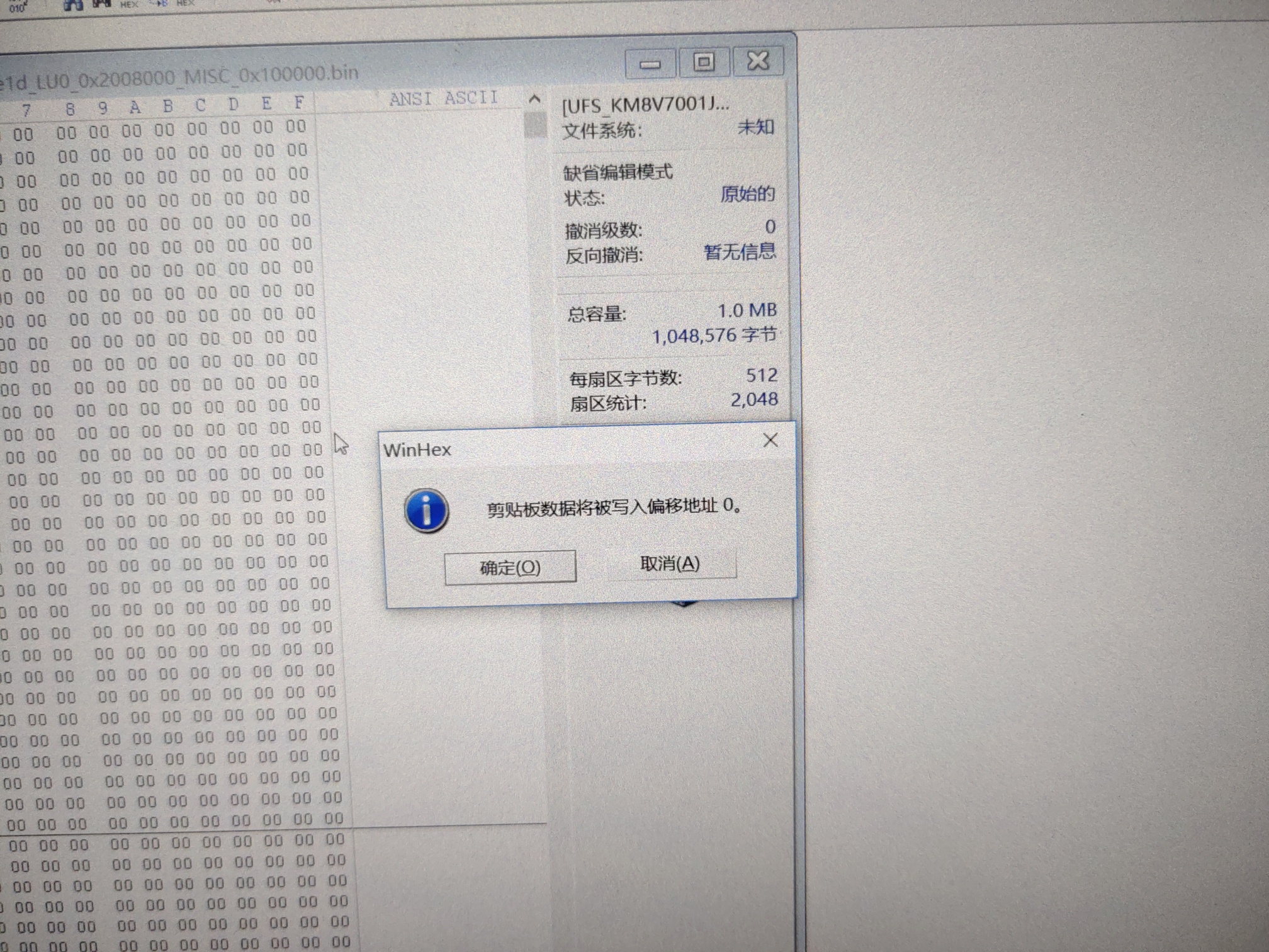 接下来,我们找到刚刚从手机读取出来的MISC文件,同样用winhex打开,这个时候,可以看到它全部为0,这个时候我们按下快捷键Ctrl+B,记住是ctrl+B。粘贴刚刚的那段指令。这个时候会提示写入偏移地址为0,一定要是为0。然后点确定,后面会有一系列提示。不用管,直接保存,点确定就完了。然后再次打开Easy软件,找到MISC文件,写入刚刚我们修改过的文件。这个时候就可以装回字库了。