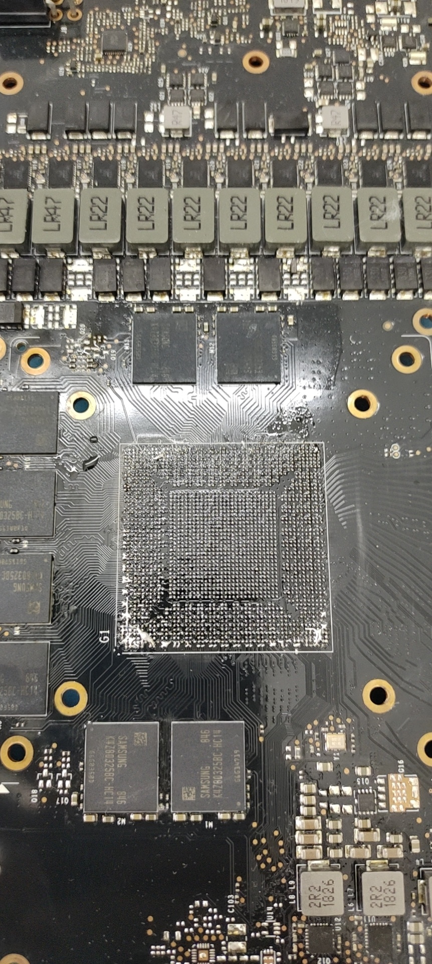 来板花屏,扫点,3颗显存花屏,一起更换,还有一个花屏,观察核心下面有 银色导热硅脂 这个东西会导电,取下核心回植,ok
