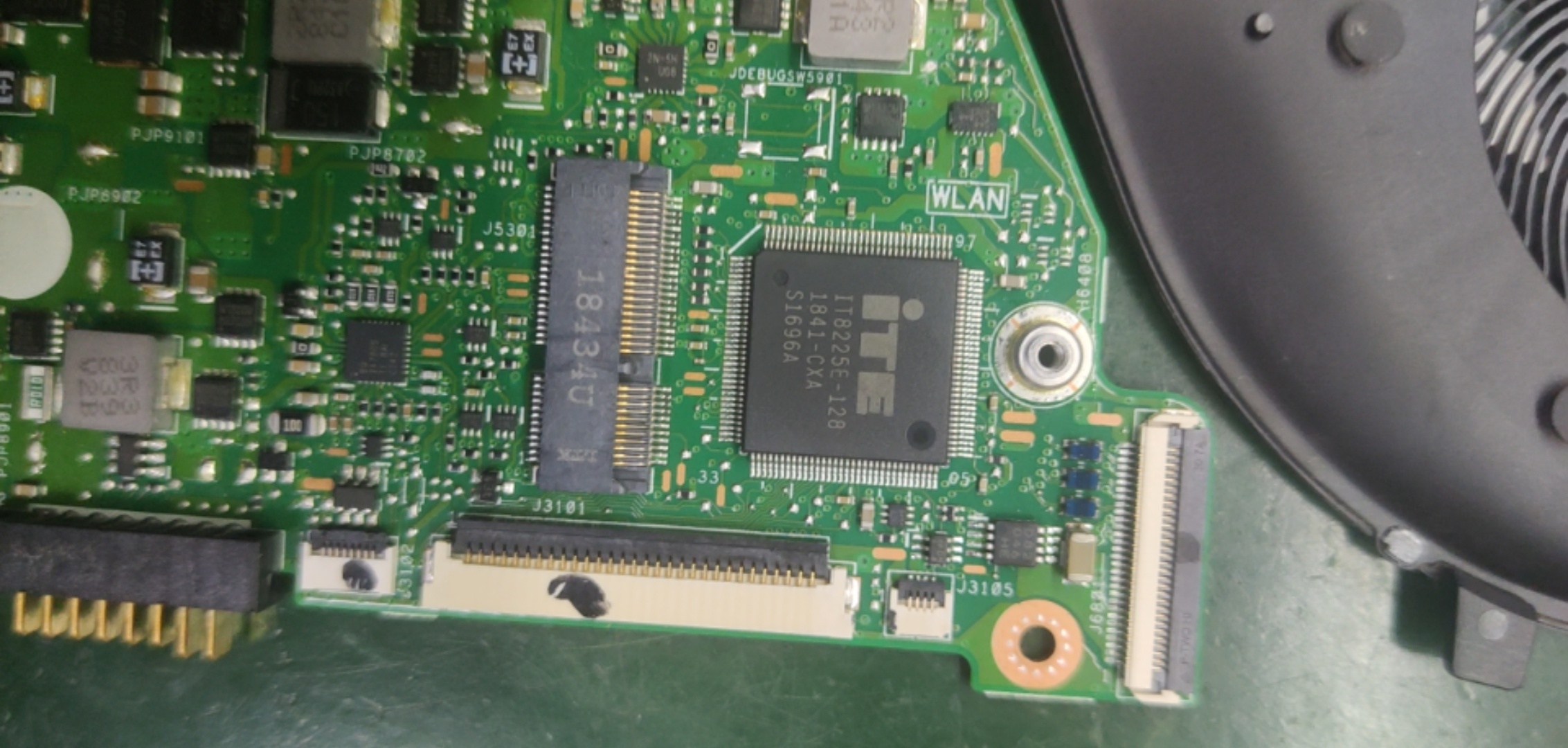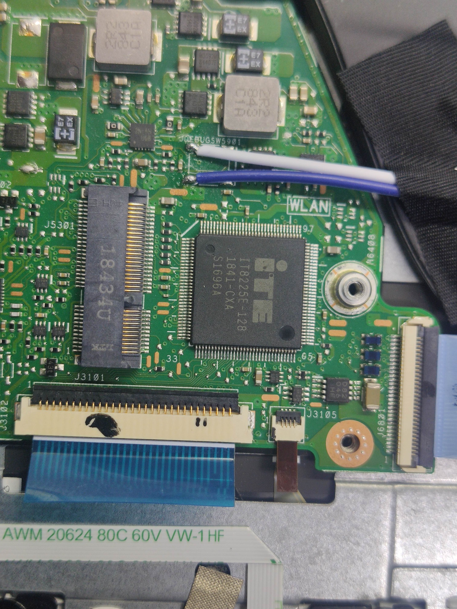 此机只插电池,不插适配器,只有线性3V电压,无待机3V、5V为正常的,可能为电池省电而设计的;短接JDEBUGSW5901(IT8225E第110脚)能正常开关机,可能为键盘上的开关坏了,位置已标注出!