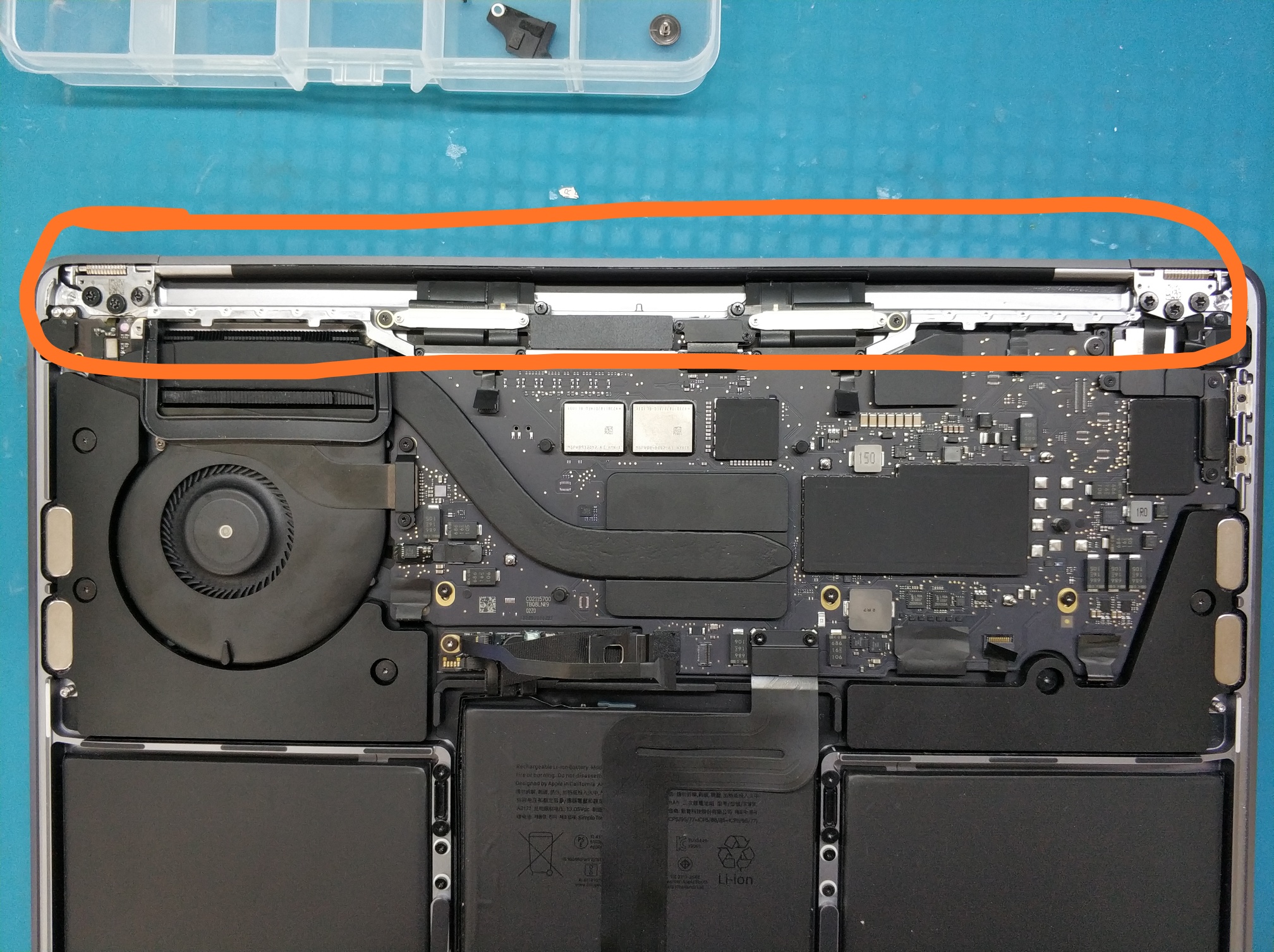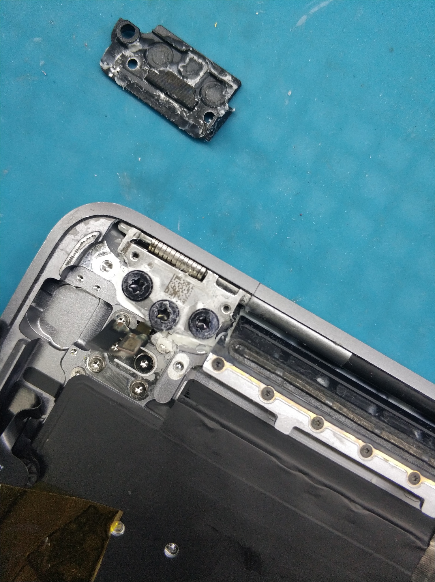 屏轴这里也进了很多酸奶,这个位置有开机键,拆下来清理干净。主板位置貌似没碰到液体。接下来拆屏,网上也没太多教材,研究了半天。