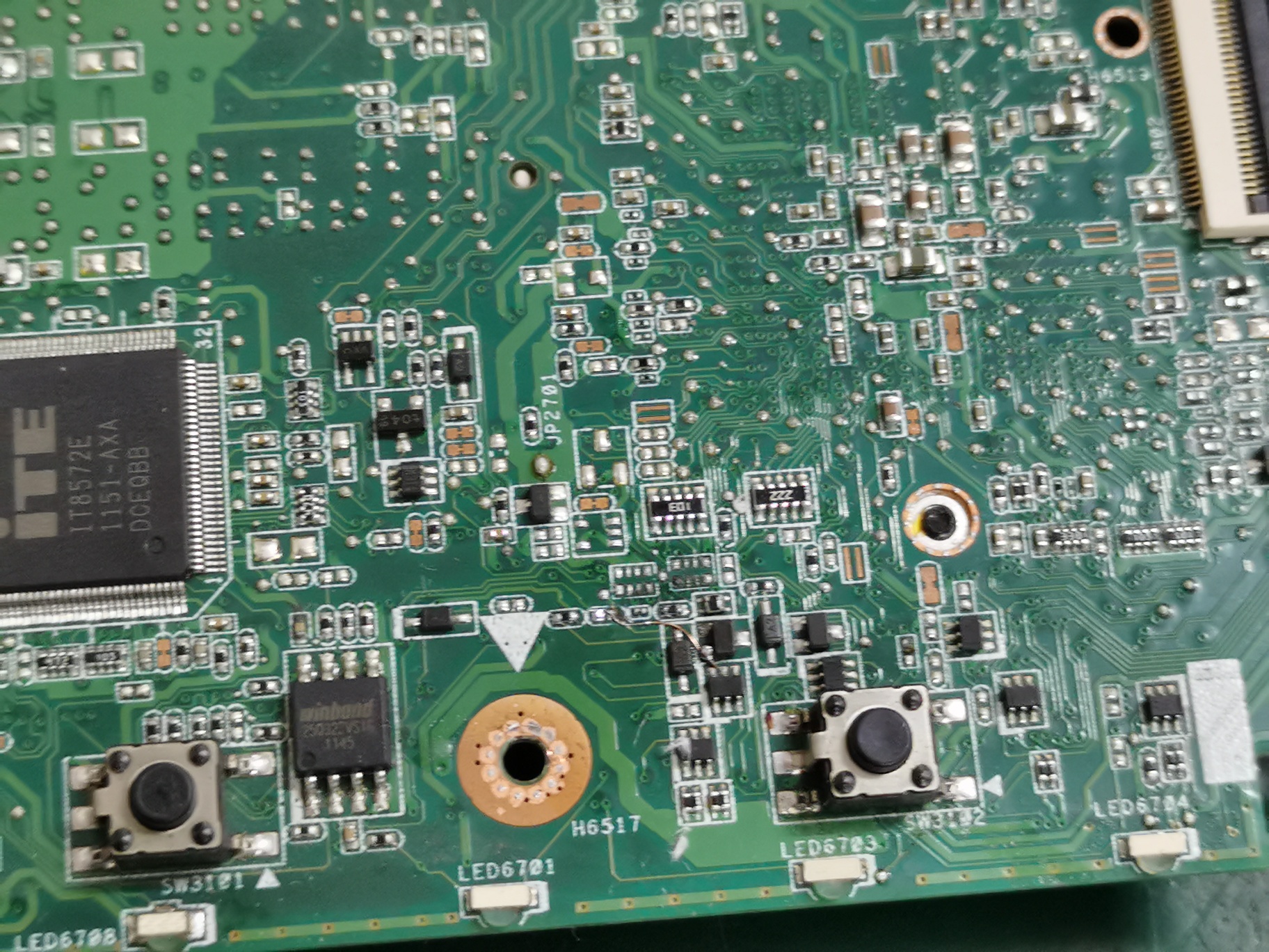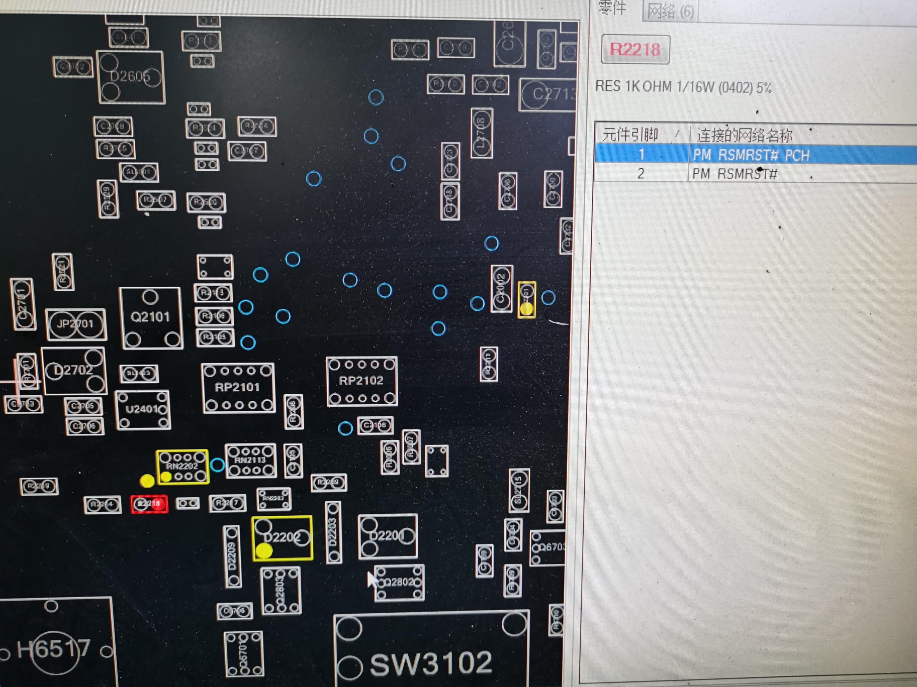 通电按开关不上电 拆机后测公共点19v 3v正常 5v正常 其余电均没有 按时序查 RTC电路正常 查桥的待机条件时 发现PM-RSMRST#不正常 追查到该电阻 发现电阻被腐蚀 焊盘也腐蚀了 该信号连接桥待机Dpwrok 桥未收到3.3v 懒得找电阻换了 拆下1k电阻 小刀刮开腐蚀的焊盘 直接飞条线 电流哗哗的上来了 拿不出手的案例 只为加点儿分 附上故障点