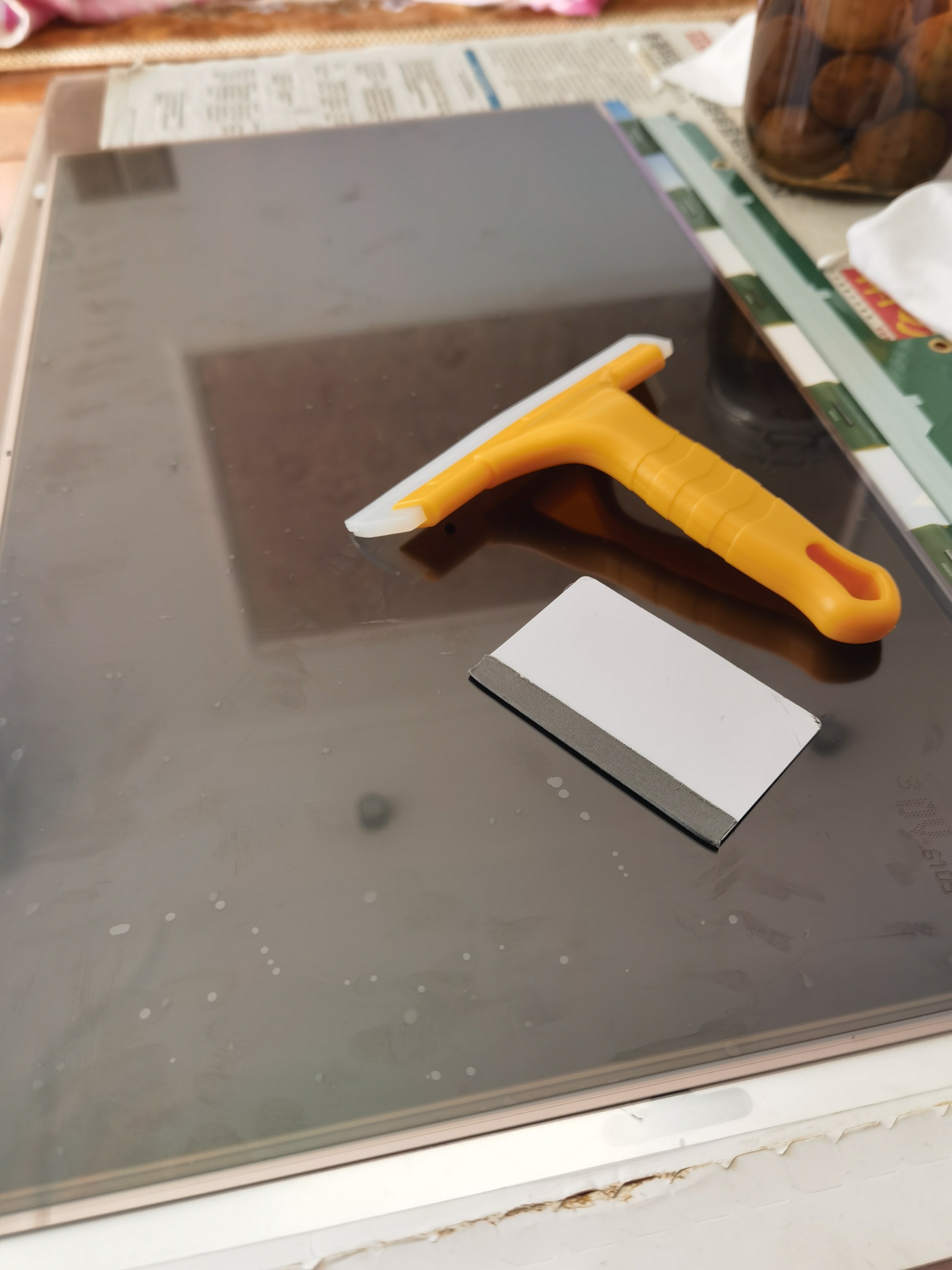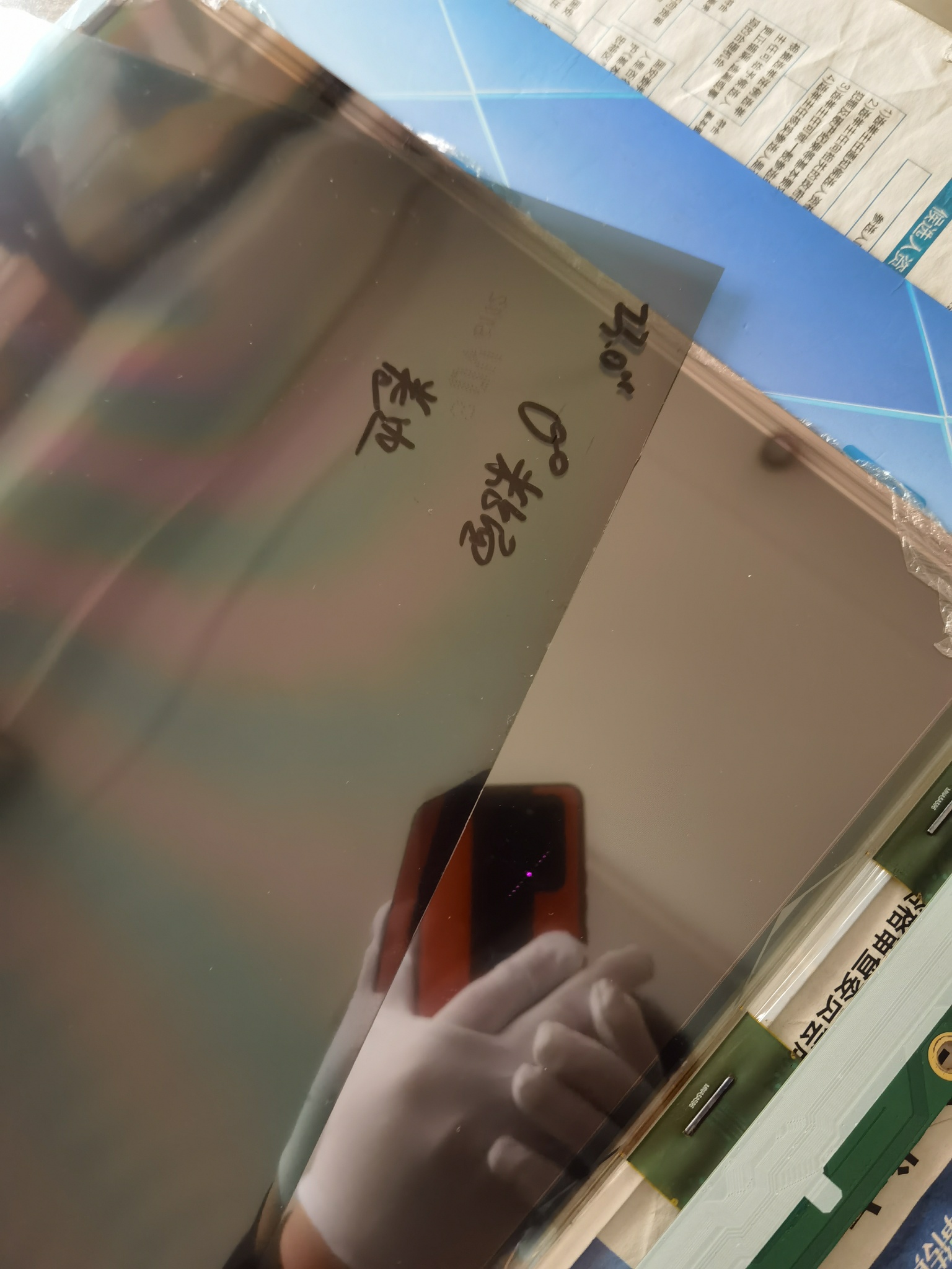 剥离显示屏内偏光膜,除旧胶,很浓的醋酸味道,不好闻