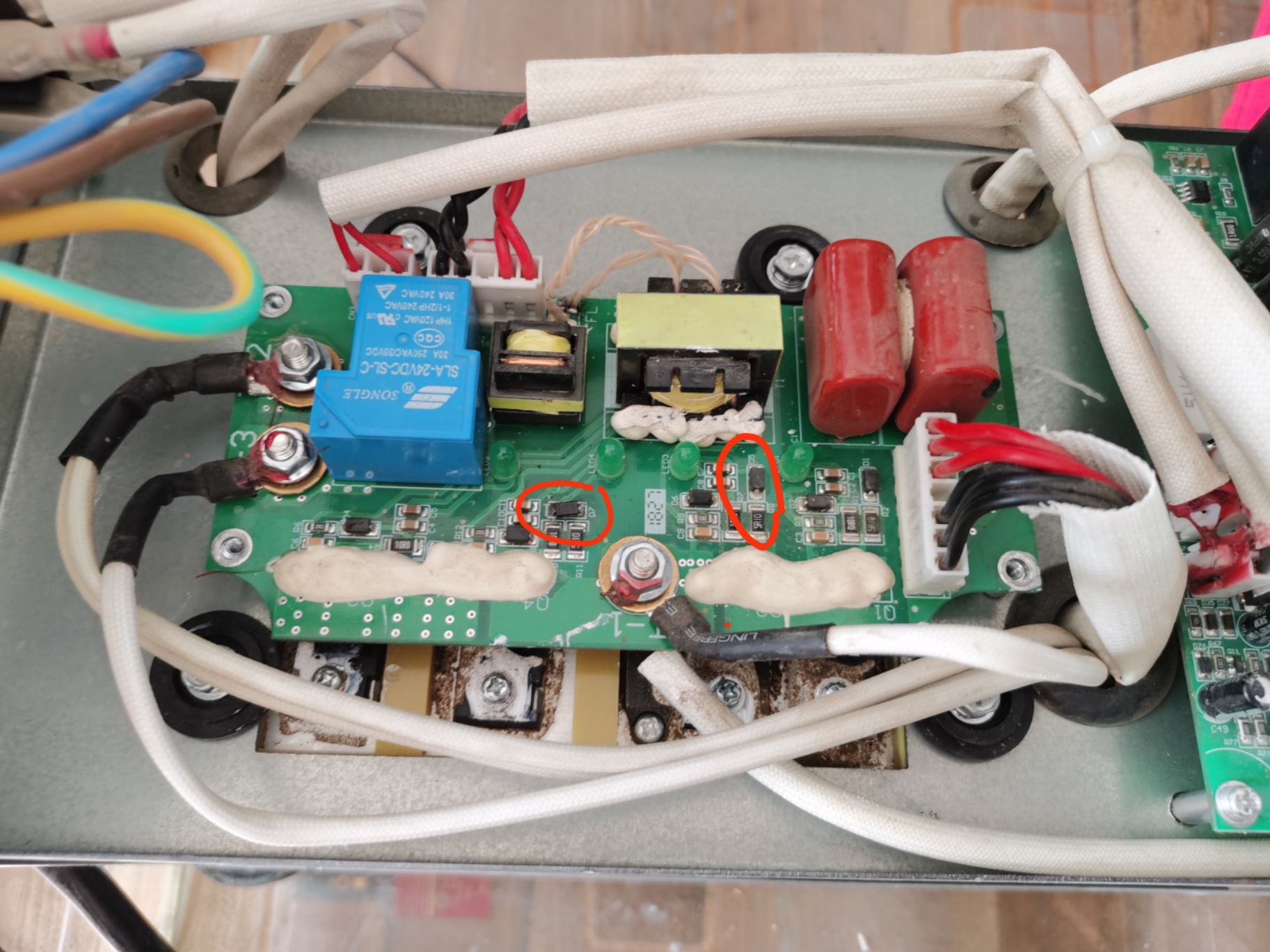 有是一个同行老师傅打发过来的电焊机,描述说是正常启动但是没有输出!拆机检查后发现前级主板驱动波形正常但是功率板没输出...检测功率板上面两个SS34二极管损坏,换掉之后四个指示灯点亮,成功修复!我严重怀疑这个牌子的电焊机是仿冒我之前修过的佳士牌的...做工非常省,四个IGBT四个60A肖特基就完事...