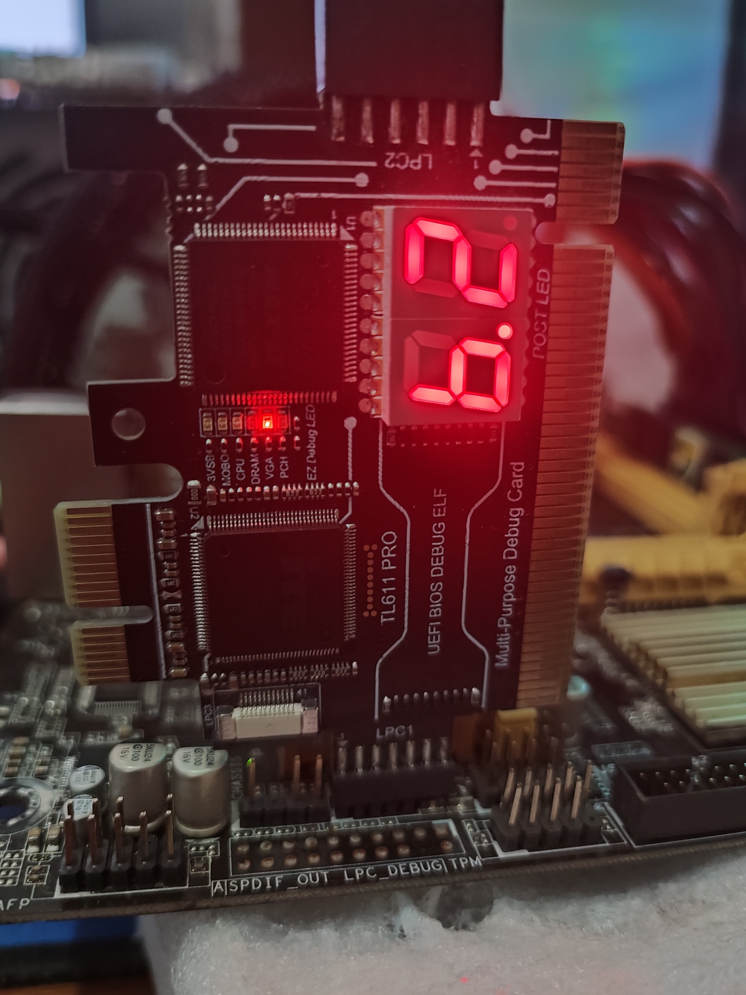 华硕B85M-K 1.01,开机跑码卡b2,集显有图中的画面但死机,点开机针可以关机,接独显无信号,点开机针可以关机,原先是正常的,更换了一颗声卡芯片并补了一颗固态电容(25脚滤波)后出现此故障,拆除声卡芯片和固态电容问题依旧,重装原先的问题依旧,有大师来看看吗