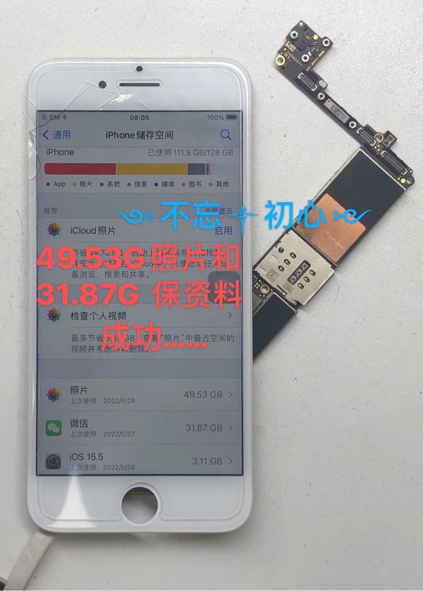 苹果7重摔上盖发热短路,单换运存后49.53GB照片和31.87GB微信数据保资料成功……