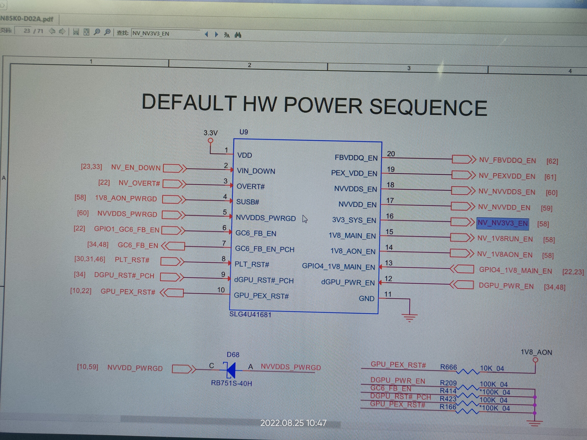 遇到一个神舟的本 经典故障 不认独显 风扇狂转自动关机 查显卡时序1V8 AON 跟1V8 MAIN开启正常 但是卡到了NV 3V3EN 量这个芯片12脚正常 1脚供电正常 猜一下 应该是芯片收到1v8AONpg信号之后 就该发出16脚的3V3EN 打阻值也无短路 请教一下大家 这个芯片具体工作流程 是不是还有忽略的地方 另外把显卡供电的所有复合管拆掉这里也不会出 感觉这个芯片本身坏的概率也不大 手头又没有代换的