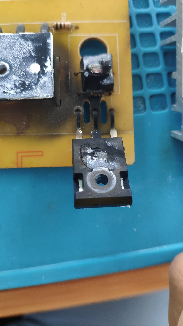 拆开散热片,发现底下pcb板已经乌漆嘛黑了。翘起IGBT一看,肚子烧炸了一个洞,估计他妈妈来了也认不出来型号了