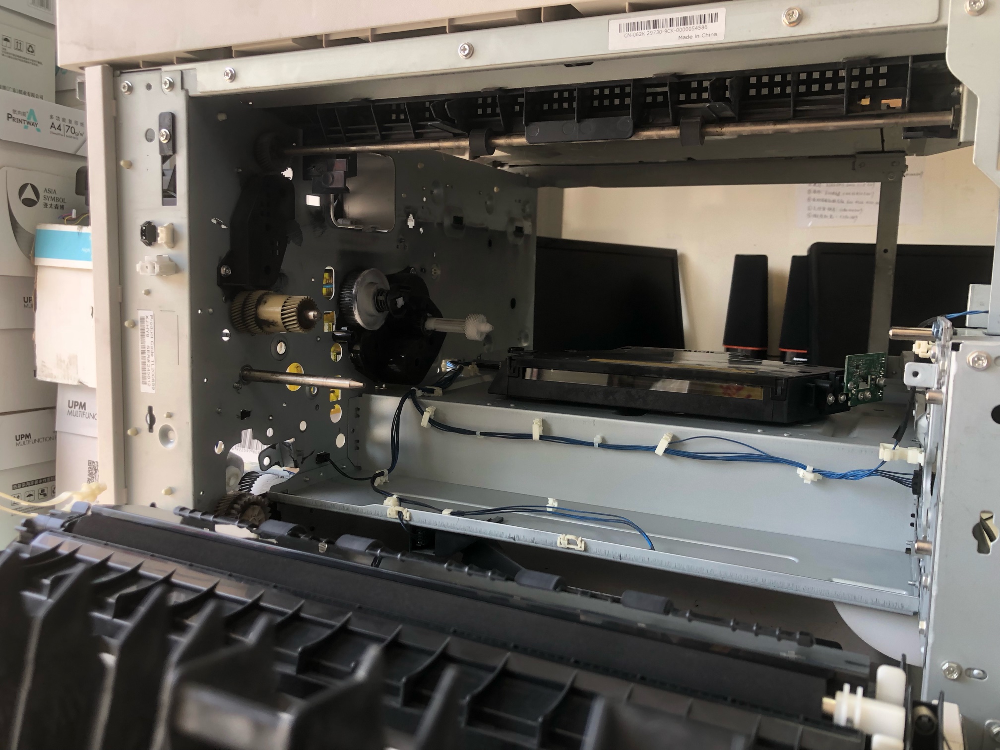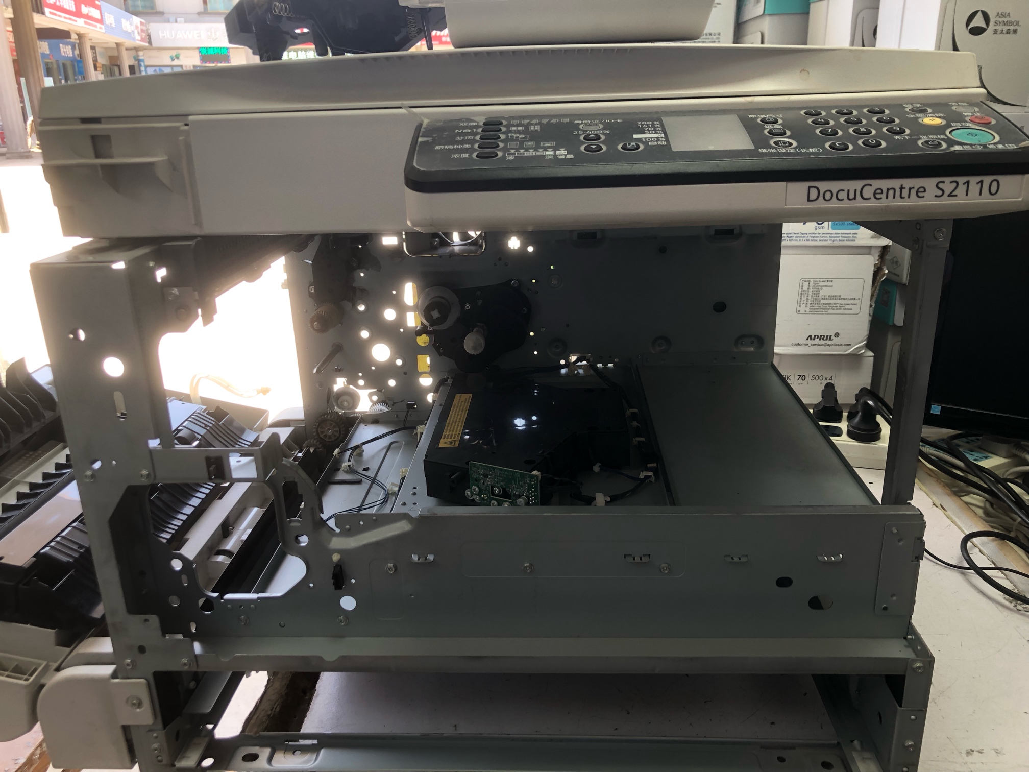 客户的施乐S2110复印机,纸走到侧面总是卡纸,起初没有注意,以为鼓组件不行了,更换之后还是不行,又更换了定影组件、转印组件,故障依旧。后来拆后盖,手动旋转主电机,发现感应鼓不转,才发现鼓驱动轴坏了。拆机时小心点就行了。