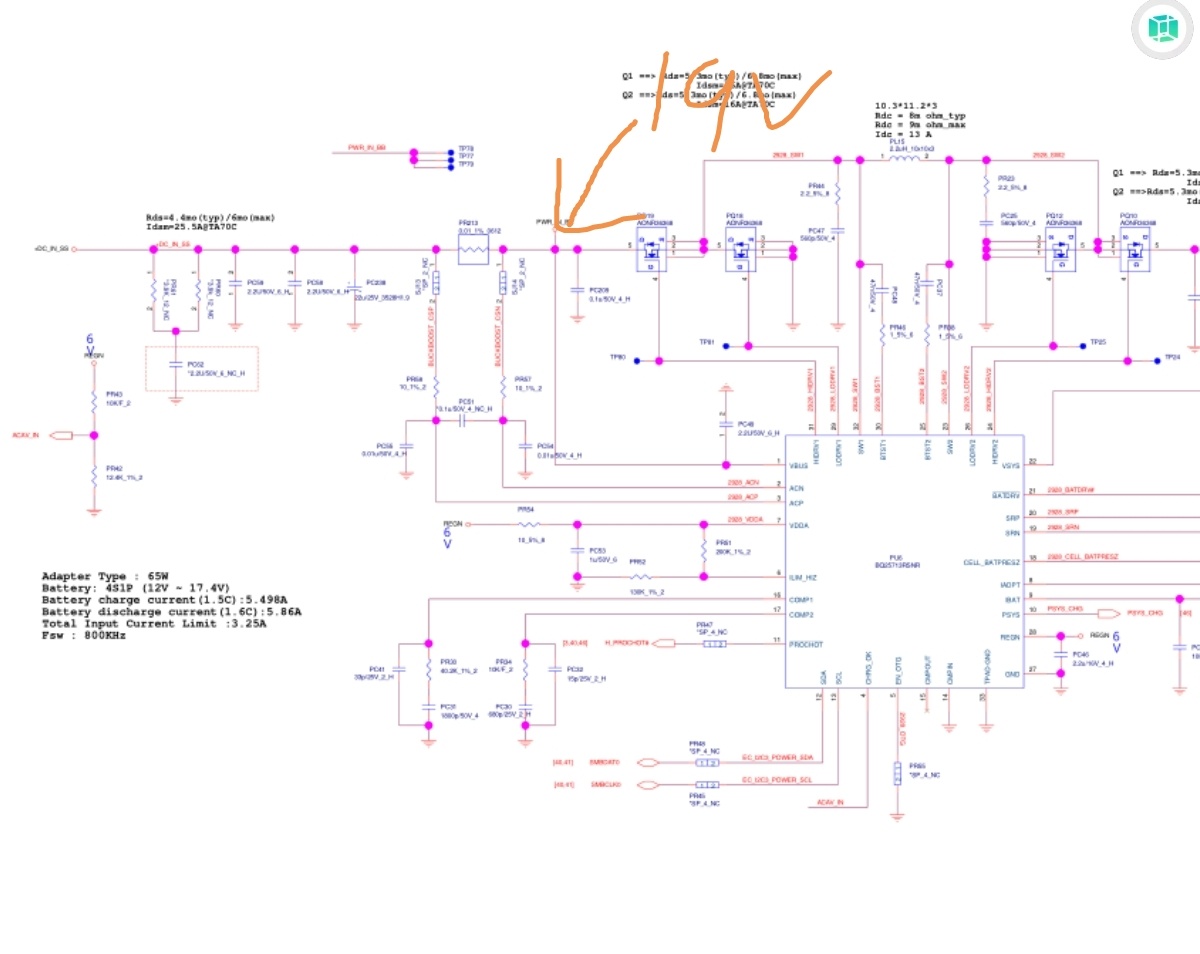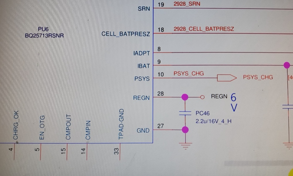 该处mos管由BQ25713芯片控制,检测该芯片有19伏输入,REGEN有6伏输出,CHRG_OK没有没有ACAC_IN电压,怀疑该芯片坏,更换后问题依旧。
