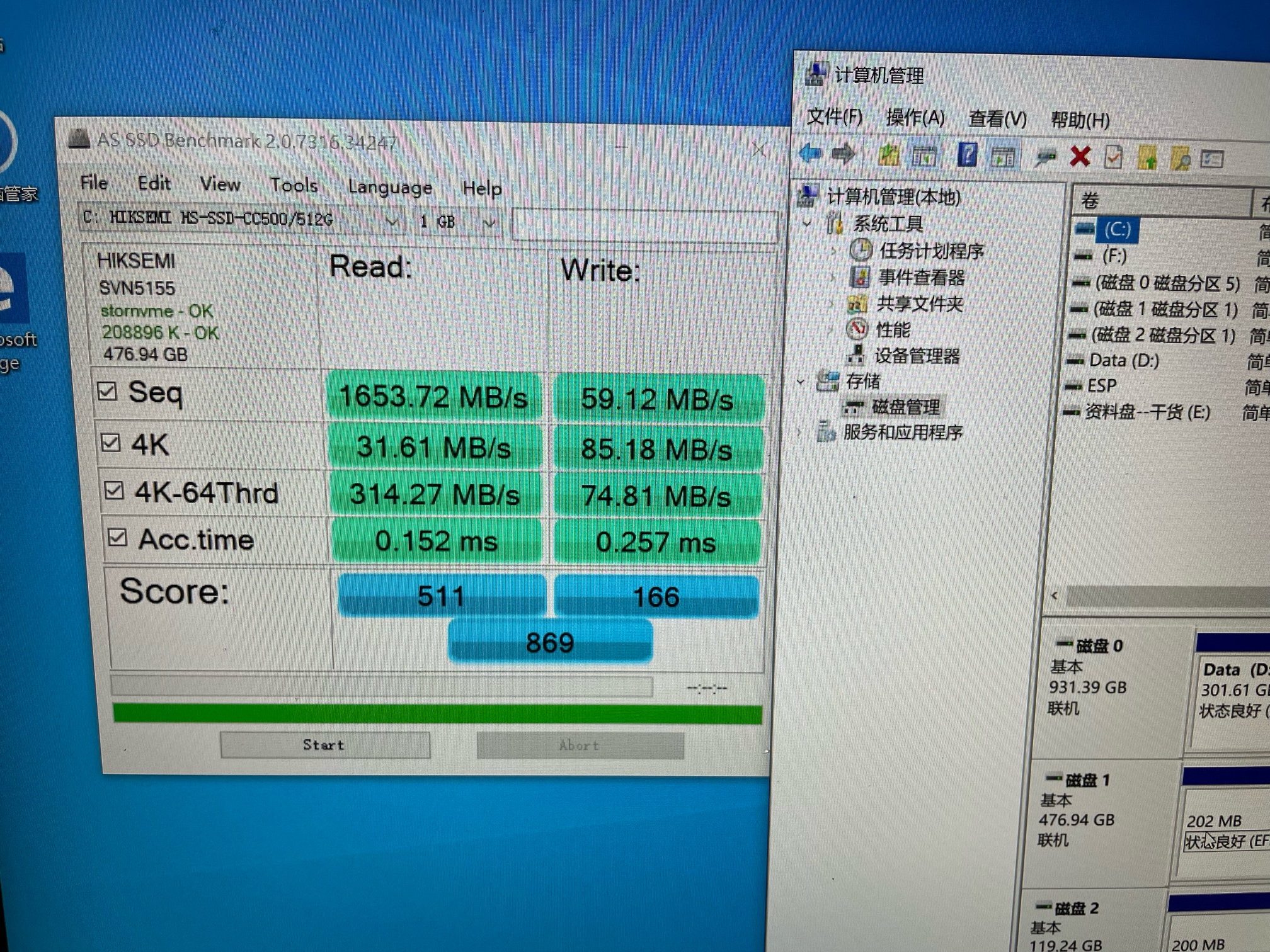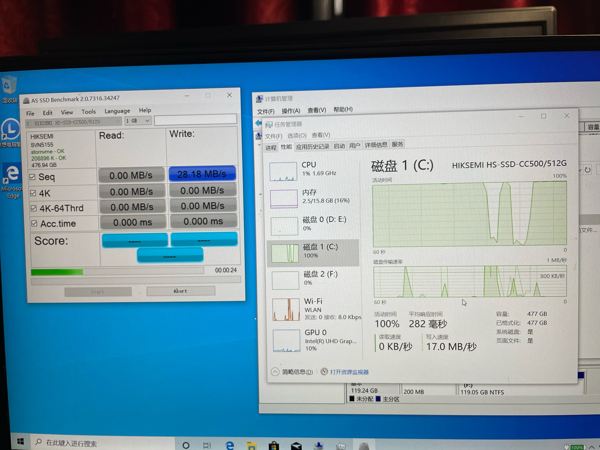 表现为可以正常读写,正常使用电脑,但是偶尔会很卡,查看任务管理器就发现很小的写入速度就满载了,包括正常情况下测试写入速度也很低,原来是1500-2000,现在只能400左右,还经常卡死,满载,就只能200左右