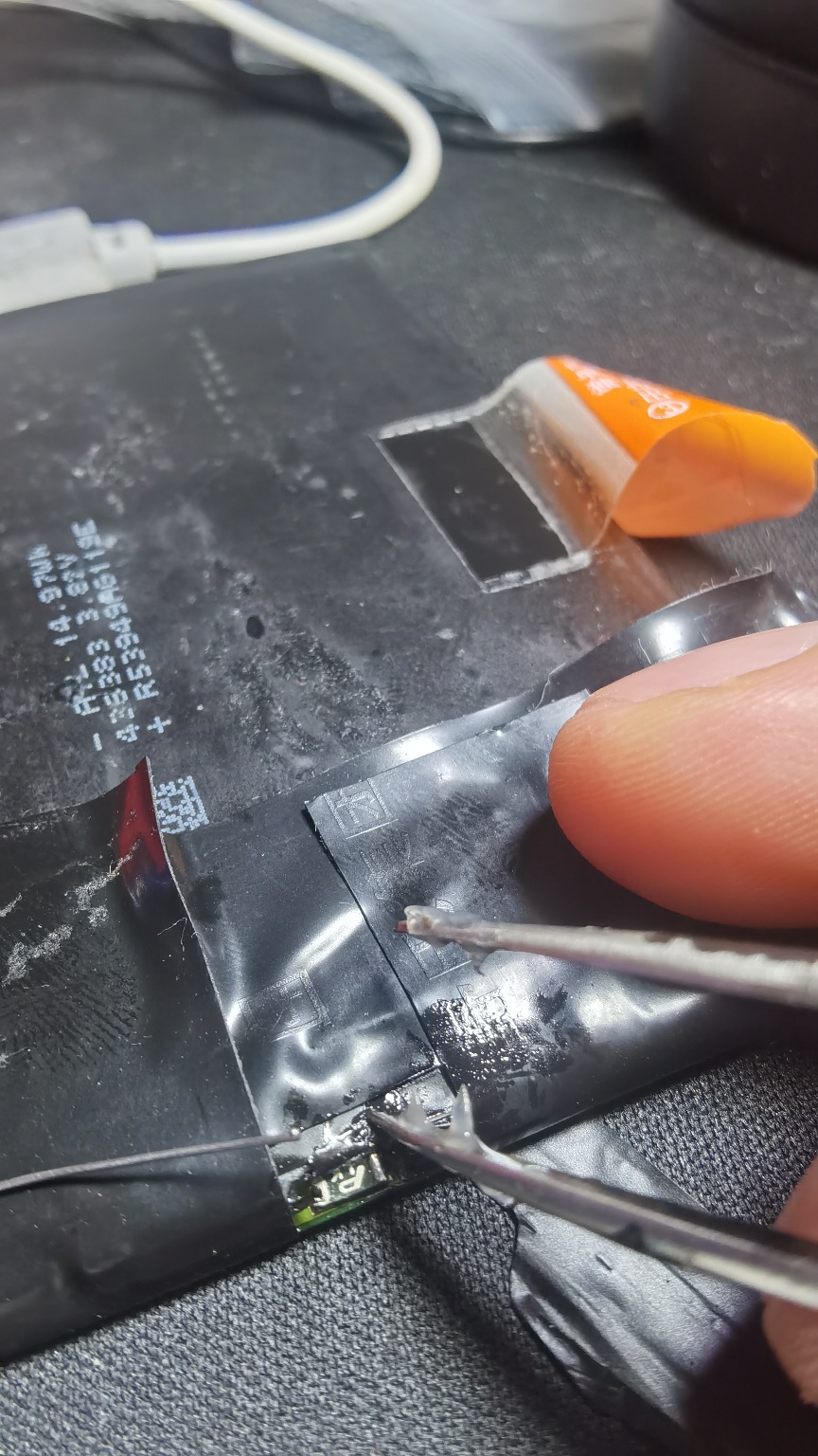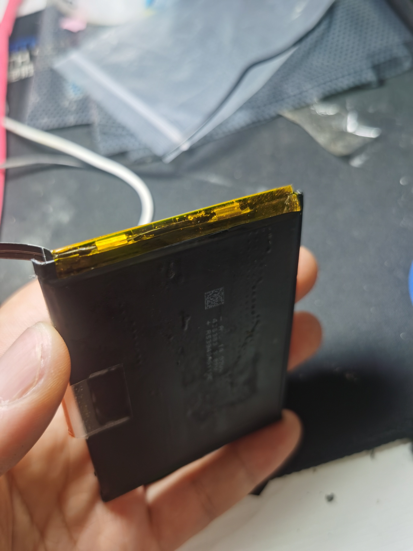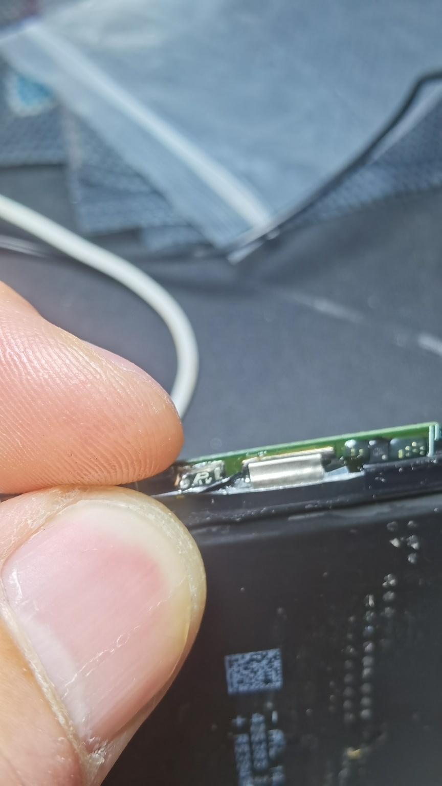 奇葩问题不开机,亲戚一台荣耀9X送修,以前进过水,给他处理过了,没换屏,这次是摔了不开机,插电可以开机,拔电断电。判断电池松了,拆机,电池没松,量了没电流,就用其它旧电池插上可以开机。判断电池问题,准备去拿电池了,想了想看到底为啥电池坏了,撕开胶带观察一个线圈电阻脱焊了,加焊测量4.1V好了装机。关系还不错的亲戚就不收钱了。