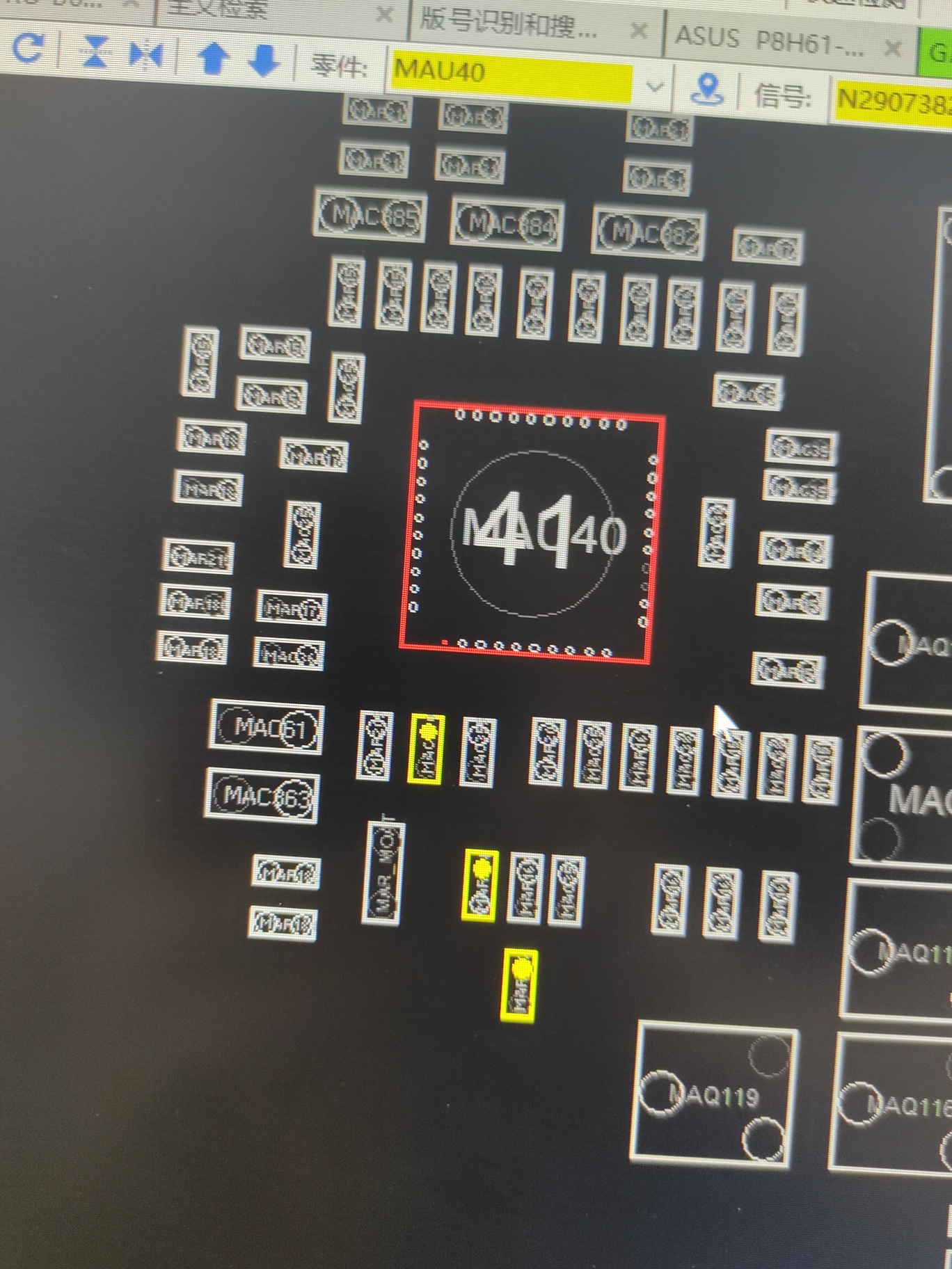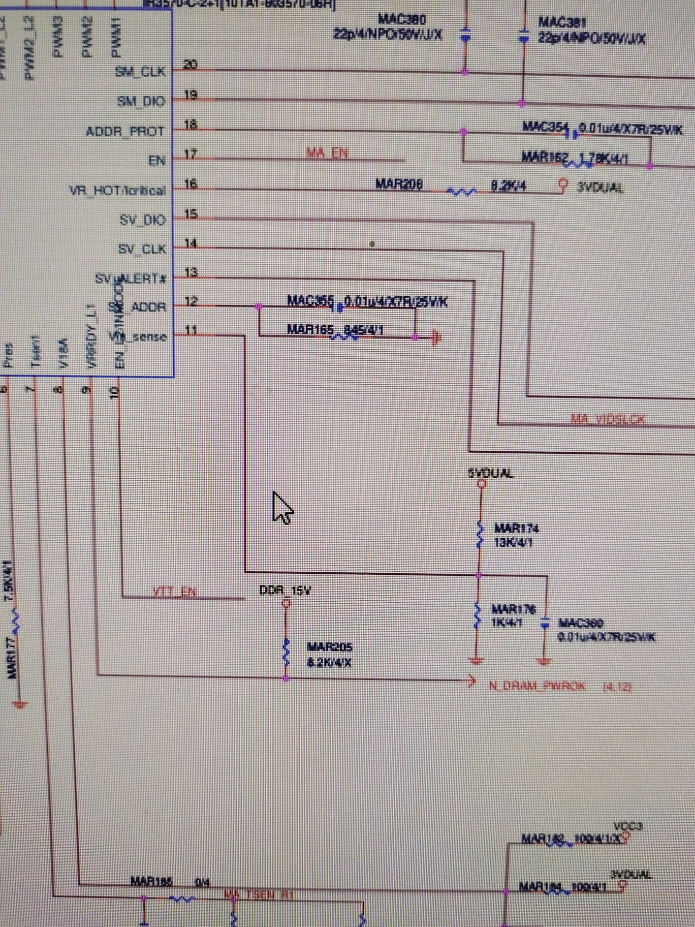 这个MAU40的11脚大概有0.36的电压,是通过5vdual分压而来的,如果没有这个电压肯定是这个13K电阻坏,或者0.01U的电容短路拉低了电压