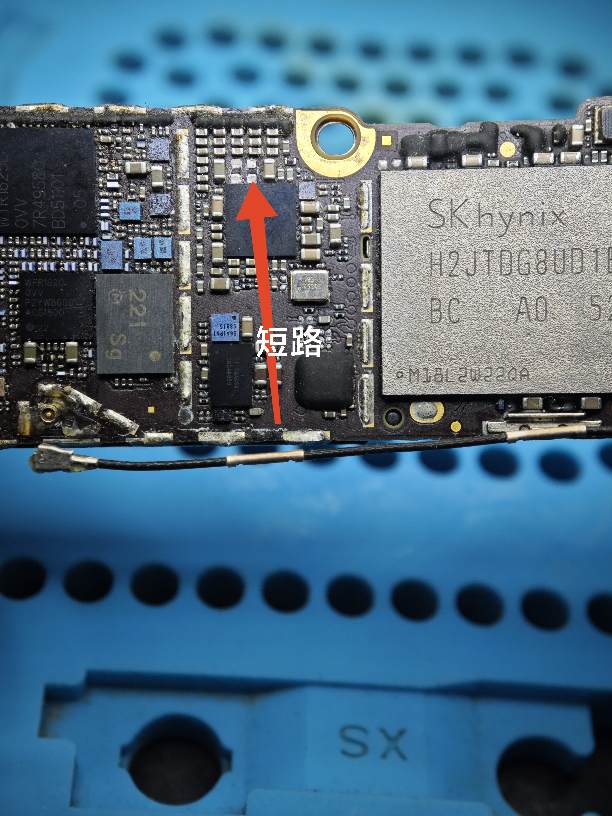 苹果6plus不开机,主供电短路。经检查见图电容短路