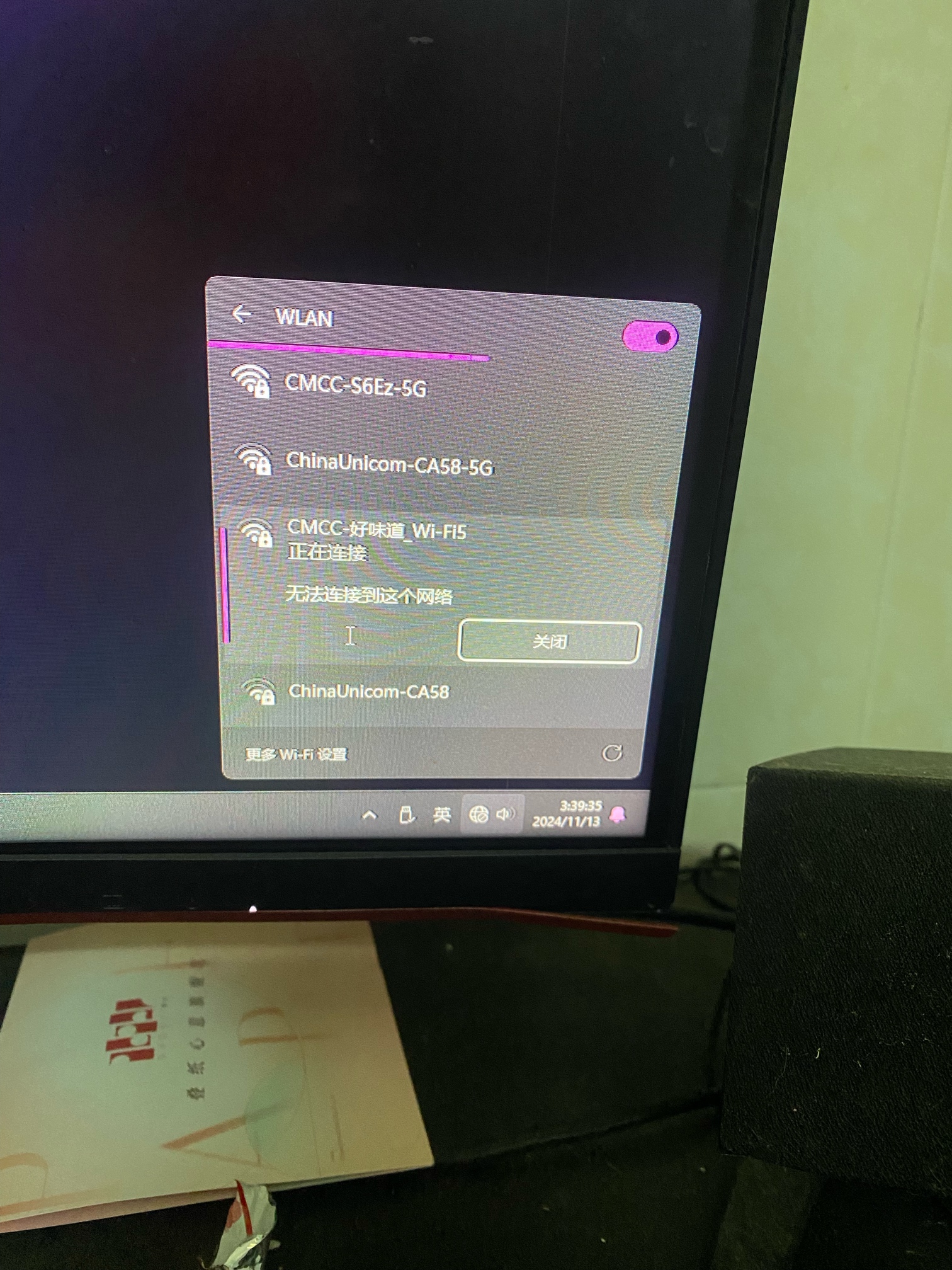 关了,重新打开可以连了,但过了一会又不行了。好奇怪之前从来没发生这种事