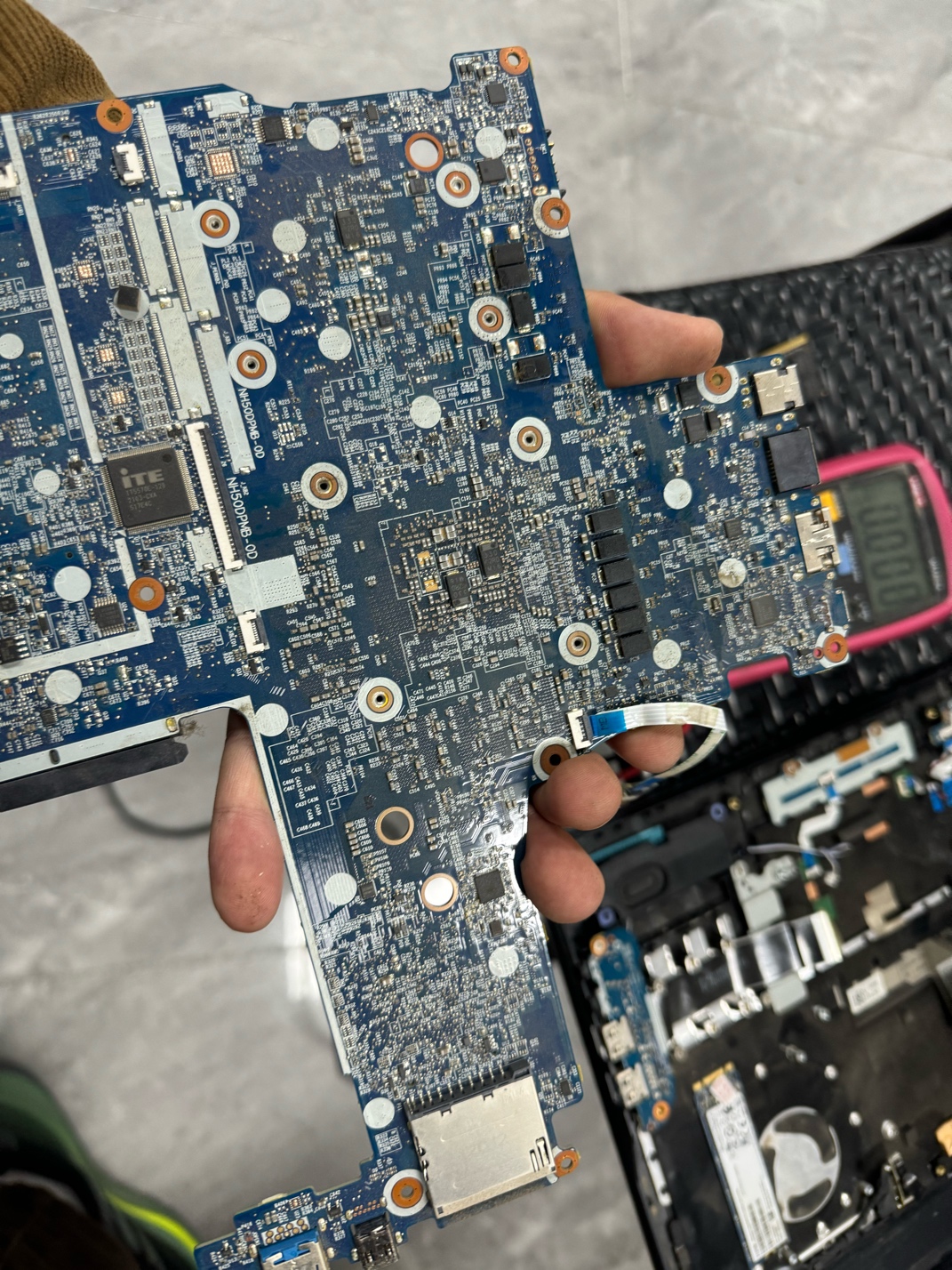 拆机测量cpu供电,显卡供电没有电压, 其他3.3-5v都有。拆开背面cpu驱动芯片没有工作,有一颗电阻氧化,PR42,19v经过这个电阻,后130K分压得到1.4v左右才能正常开启!!补焊就可以了!!
