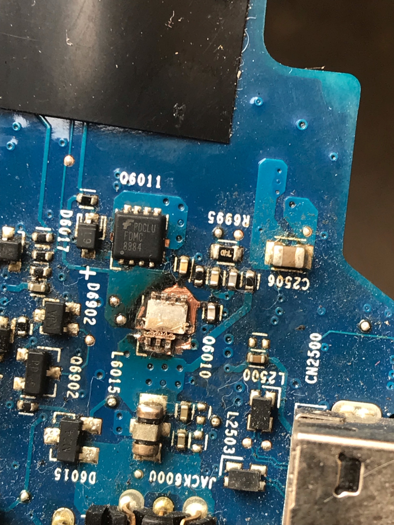 求助:惠普2570P充电口旁边的场效应管烧了,只有下管型号找不到烧了的这个型号,图纸也找不到,,有知道的师傅帮忙提供一下方法,谢谢啦!
