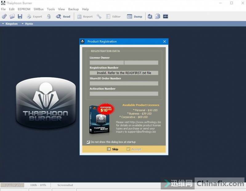 采用台风软件刷DDR3内存条,完美解开机报警。前几天魅力两个威刚内存条,与自己原来的宇瞻不兼容,后面通过刷了兼容的金士顿SPD,终于用上了16G的内存。本帖仅仅是软件注册,刷SPD教程比较简单,就不说了。1. 启动Thaiphoon Burner