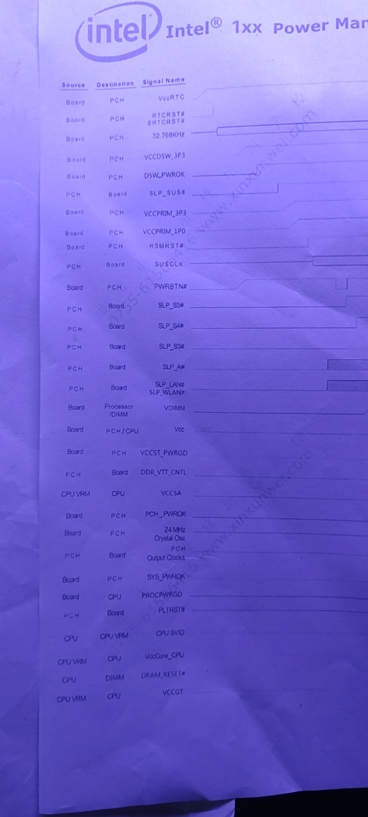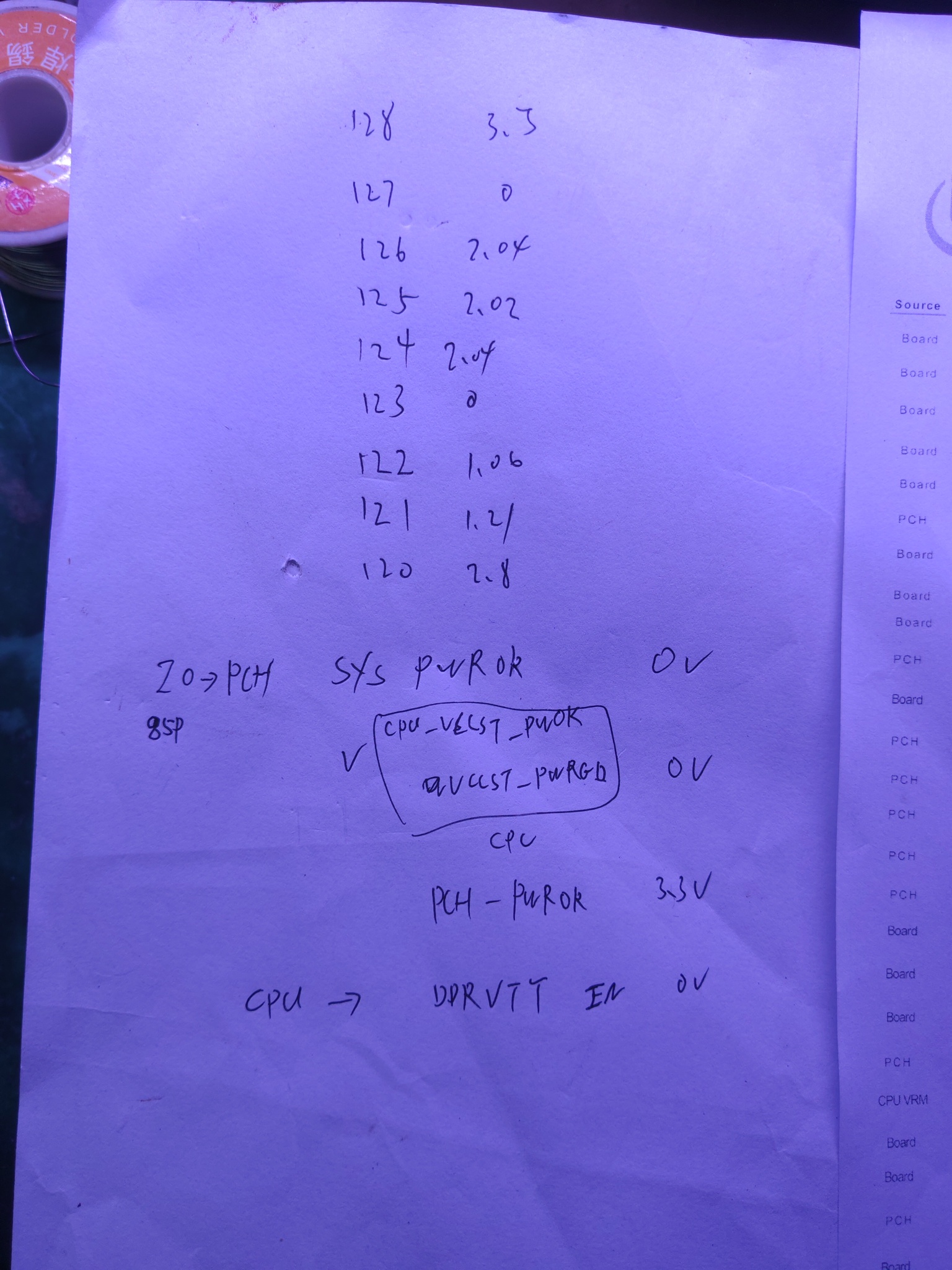 手中两块技嘉B150M D3V 1.0版的主板。故障上电重启反复。根据时序测了一遍,除CPU电压,其它电压都有,有个2.5v的电压有的时候一直有,如果重新上电有时又没有。IO发出的system pwrok没有。VCCST PWRGD没有.IO的电压检测脚除了没有CPU和集显供电,其他都正常。BIOS刷过几个,一样不跑马。求高手帮我理下IO时序,收到什么发出什么?感谢