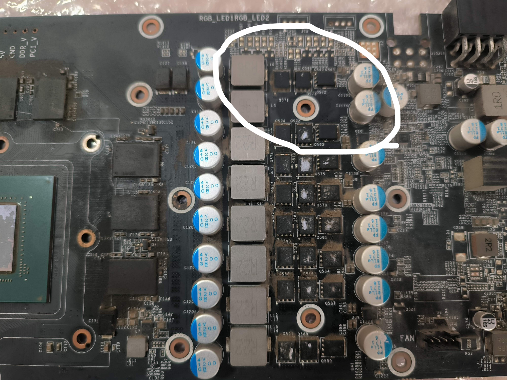 新手修耕升p104显卡测量没有显存供电(圈出来的地方)上管g级也没电压,显存的供电芯片是哪颗啊?怎么找不到,有哪位高手可以帮我找出吗?核心供电有0.78v,但gpu一点也不热