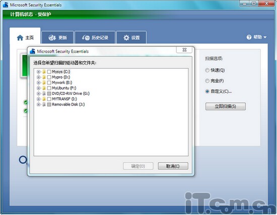 MSE中文测试版主要提供了三种扫描方式,快速扫描,完全扫描以及自定义扫描。