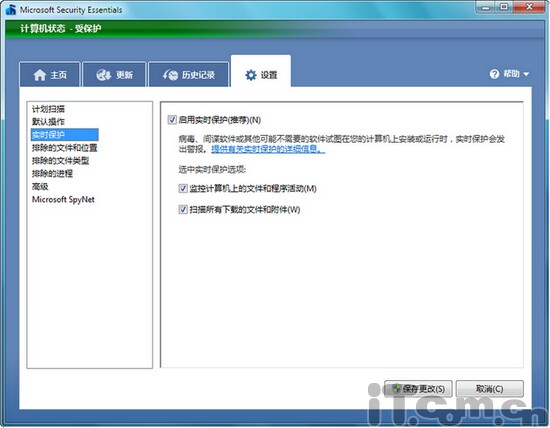 MSE中文测试版设置模块——实时保护配置界面,提供了对于实时监控系统的一些配置操作,主要是监控的对象是程序的运行以及刚刚下载的文件。