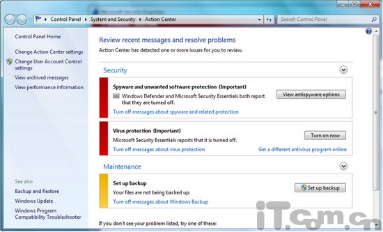 在Windows 7的活动中心里可以看到默认的杀毒软件有两个,一个是Windows Defender,另一个是刚刚安装的Microsoft Security Essential。不知道是否又会想浏览器一样引来杀毒厂商们的讨伐?