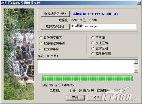 在备份分区时,在指定好源分区和文件路径后,还需用户根据自己的需要,选择按所有扇区、存储结构或文件的备份任务,以及压缩类型。如有需要另外说明的内容,用户还可以加以800字节以内的备注。