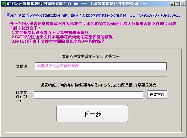 MDFScan数据库碎片文件扫描恢复软件是一款用来恢复FAT32删除或者格式化后的MS SQL数据库文件,或者是因为文件太大,在NTFS删除文件后的文件长度变成0字节而无法恢复的情况。您现在下载的是客户端软件,下载后用我们的数据库恢复软件对丢失数据的盘进行扫描后形成一个扩展名是mdfmf的磁盘镜像文件,将这个文件传给我们,我们的工程师用服务端软件对这个文件进行深入仔细的分析,重组出原始的文件碎片信息保存成一个MDF文件进行恢复。请在数据库文件丢失后,不要往这个盘存东西,也不要尝试对数据库进行恢复到某个状态或者重建数据库等操作,原始的磁盘状态保存越好,MDF文件被完整恢复的可能性越大。